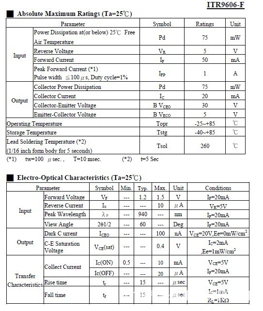 ITR9606-F包括一个红外发光二极管和一个NPN硅光电晶体管,包裹由端侧聚光光学轴在一个黑色的热塑性外壳上,光电晶体管接收的辐射的IRED只。这是正常的情况。但是当一个对象是在两者之间时,光电晶体管无法接收的辐射。对于附加组件的信息,请参阅IR928-6C-F和PT928-6C-F