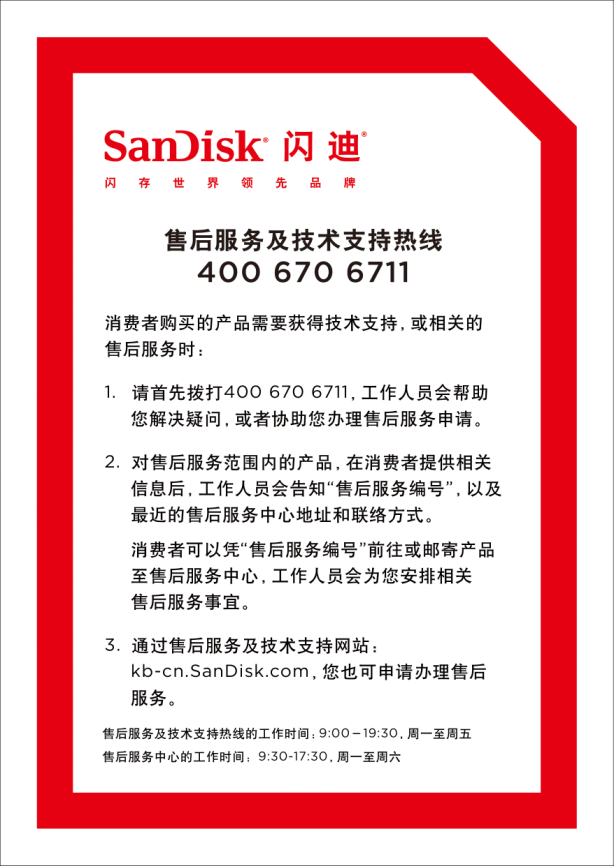 SanDisk(闪迪)CZ40 U盘8GB产品提供5年的保固和免费技术支持服务,消费者可拨打闪迪技术支持热线400-670-6711. |