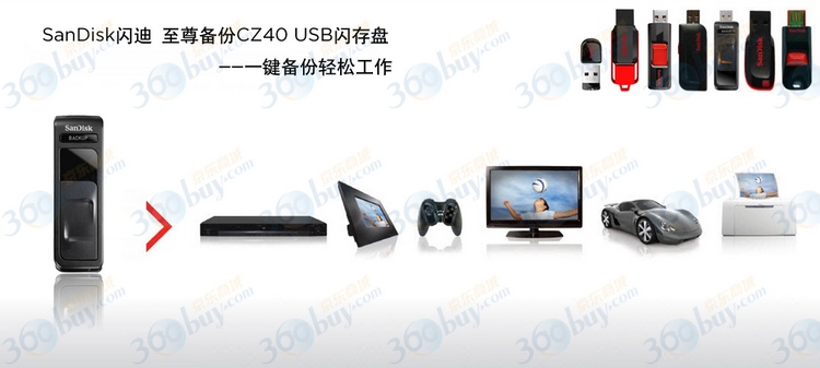 SanDisk(闪迪)推荐全新至尊备份CZ40 USB闪存盘,首款带有备份按钮的 USB 闪存盘。无线缆。无烦恼。一种保护您最喜欢的照片、视频、歌曲以及其他内容的更简单的方式,以便您始终随身携带。至尊备份CZ40 提供8GB 、16GB、32GB和64GB的容量可供选择。