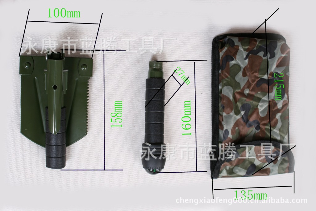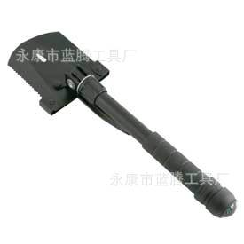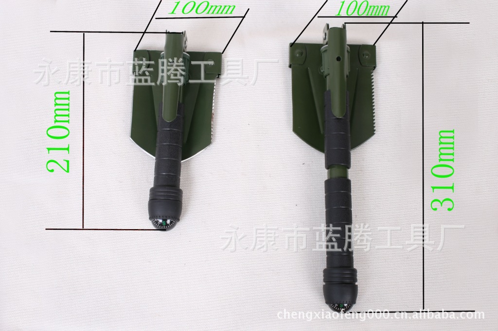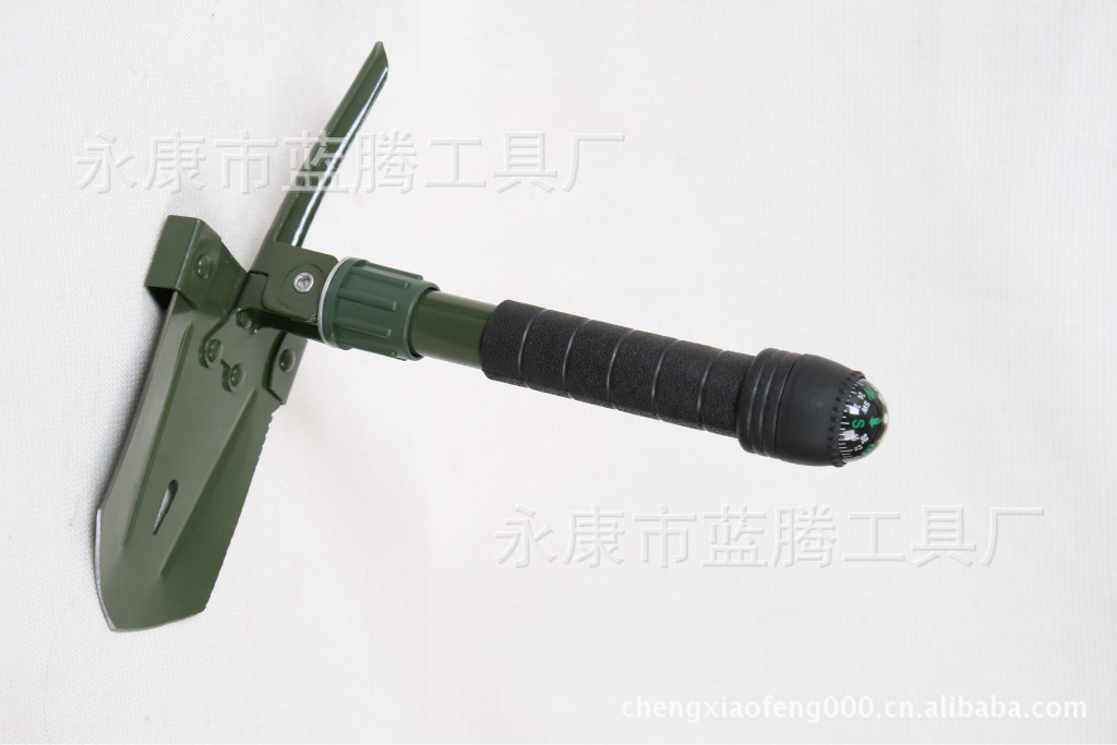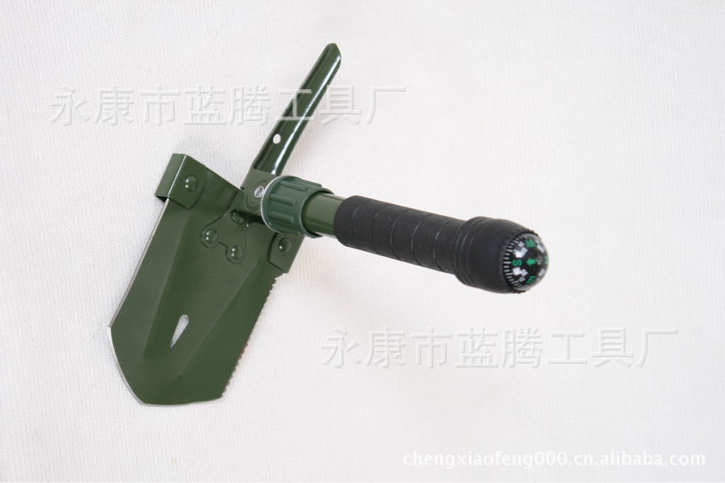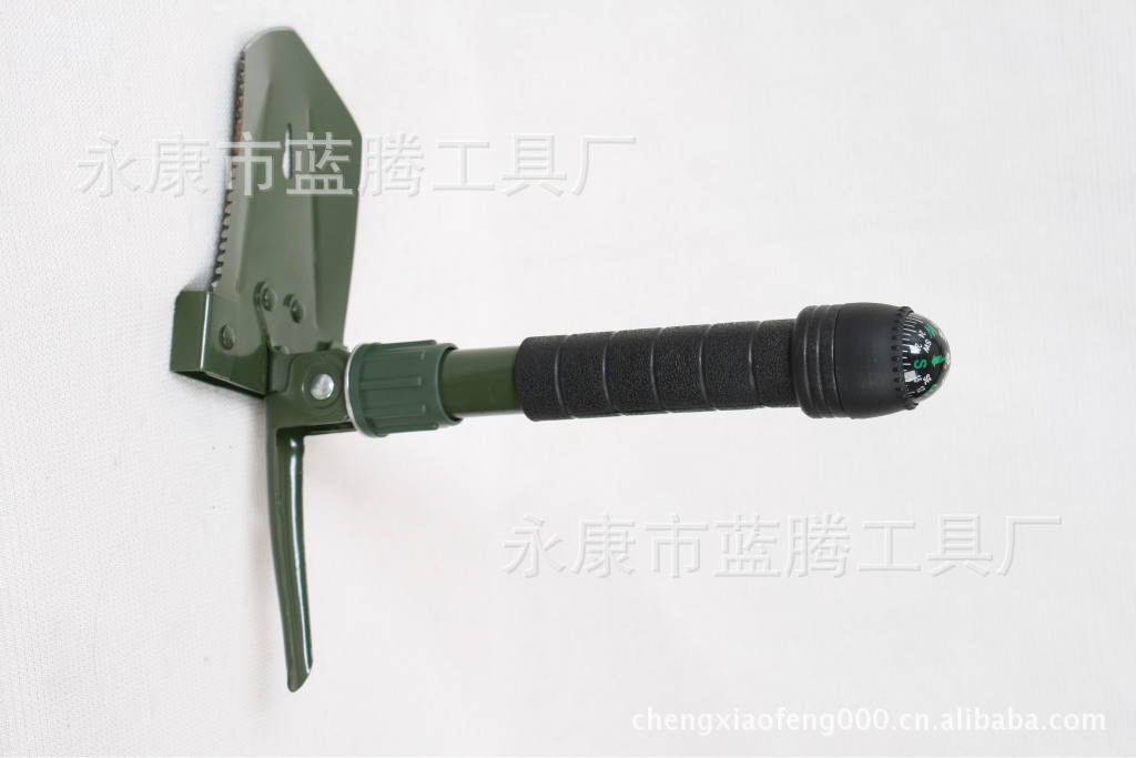 LT1017型折叠铲的最大特点就是手柄处有两个用TRP软性塑胶做成的护手套可以方便使用者作用力和更好的保护双手,顶部还有含油球型指南针。