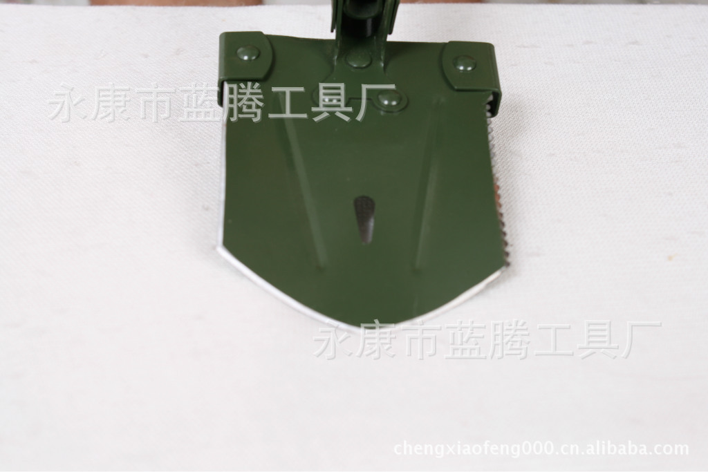 本折叠铲锹面铲面用高碳工具钢:50#钢、65#钢也按客户要求使用高碳合金钢:65Mn、硼钢钢片制做而成,钢片经整体调质处理以获取优良的综合力学性能:高强度、高韧性,再经高吨位冲床冲裁、压制成型后用金刚石砂轮磨床对铲(锹)面的边缘刃口和边缘锯齿精细磨削处理,铲(锹)面锋利异常完全符合野外工作的需要。