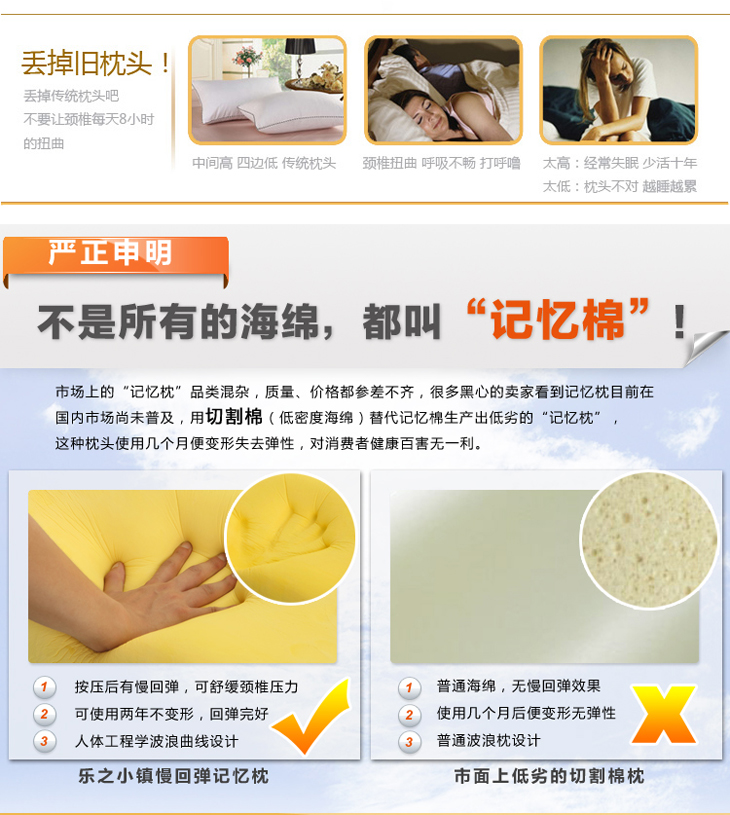 3、与传统海棉、取脂棉的区别:太空记忆棉吸收您身体的重量,感觉就像漂浮在空中。它遵循你的体型而不是像海棉、聚脂棉一样对抗您的体型,让您来适应它。他们通过让脊椎和关节以其自然的生理状态休息而提供身体和头颈、腰部完全的支持。完全释放压力,享受一种前所未有的无重感。