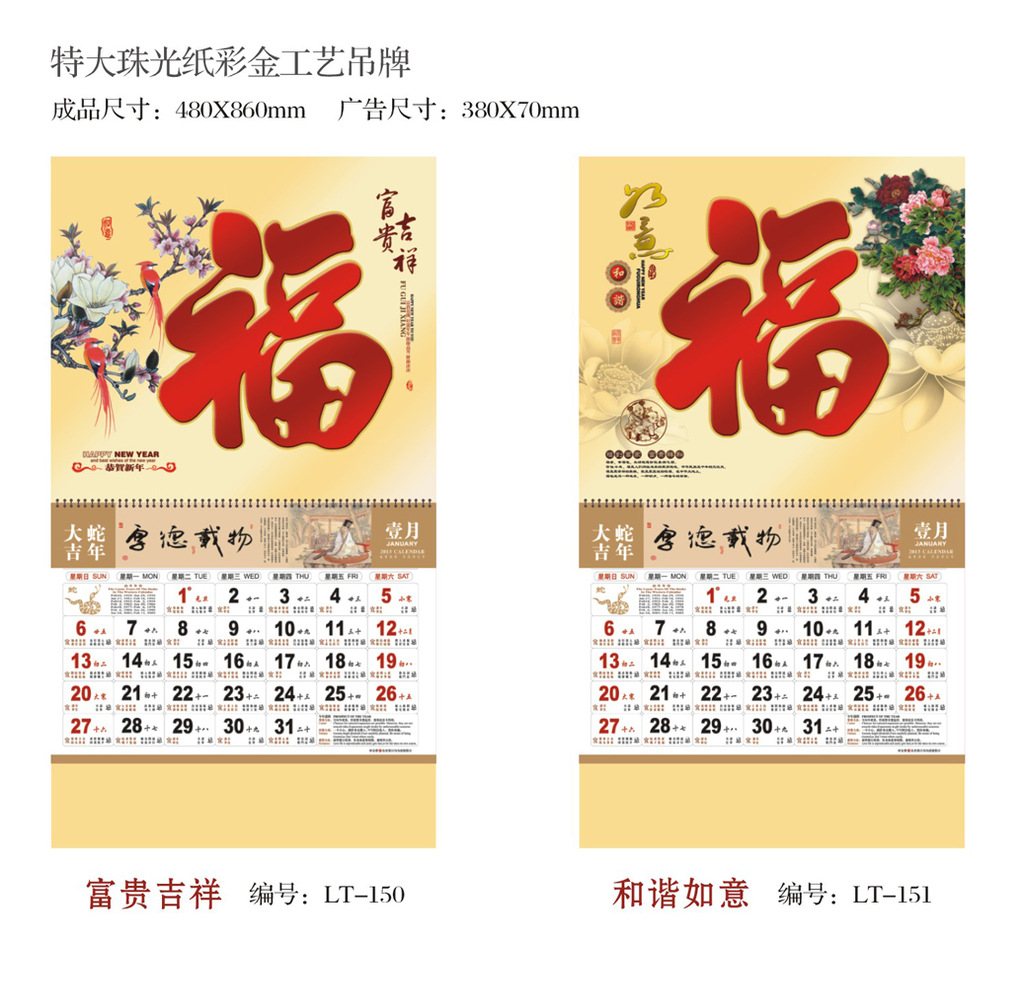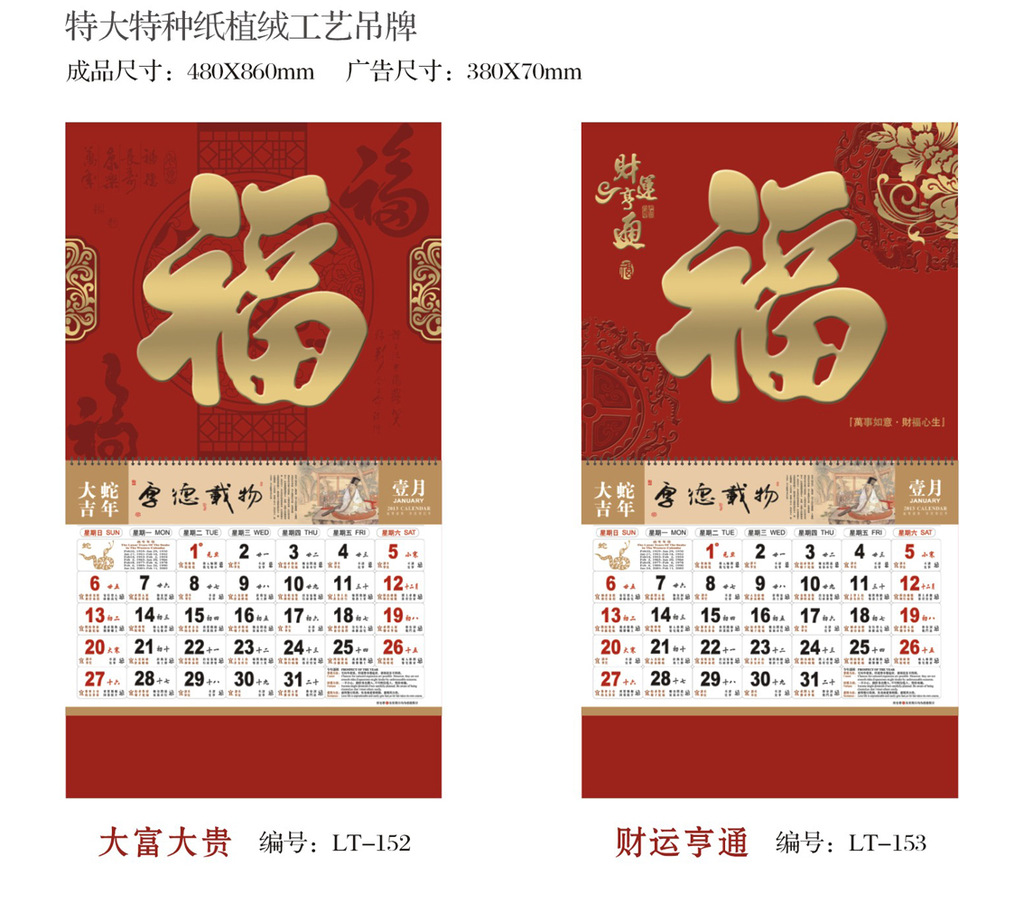此款特大珠光纸彩金工艺吊牌、特大特种纸植绒工艺吊牌。吊牌尺寸:480*860mm,广告尺寸380*70mm。建议同等质量比价格,相信可以选择自己更实惠,送礼更大方的高档挂历