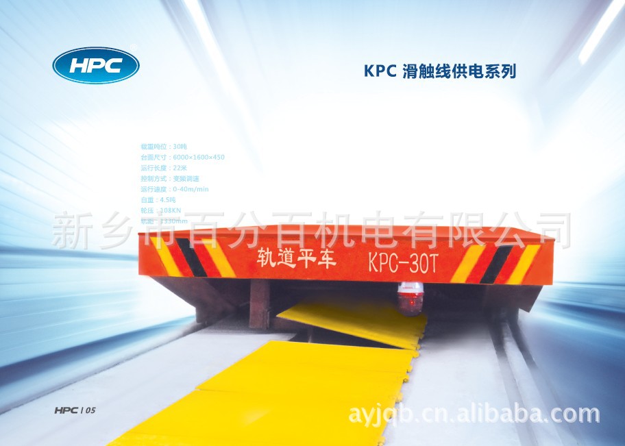 其中,“百分百”KPC系列是滑触线供电轨道平车,是将交流380v的安全滑触线直接引入平车交流控制系统,来控制平车的启动、停止、前进、后退等,通过平车的移动带动安全滑触线的滑块来实现给平车供电,安全滑触线受安装位置的限制,可以安装在轨道中间或道轨外侧地沟内,为了安全和方便可以在地沟上方增加盖板,通过自动翻板装置,来实现地沟内的电源引入轨道平车上.