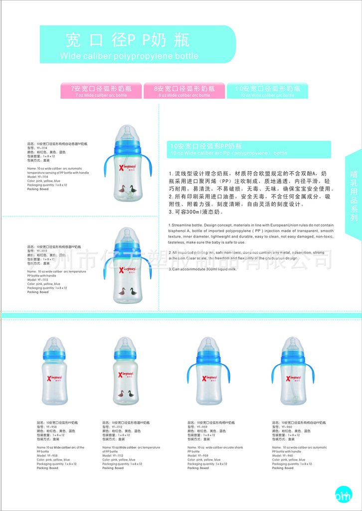 10安宽口径弧形感温有柄自动PP奶瓶,聚丙烯奶瓶