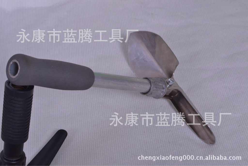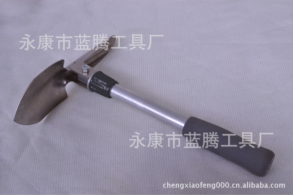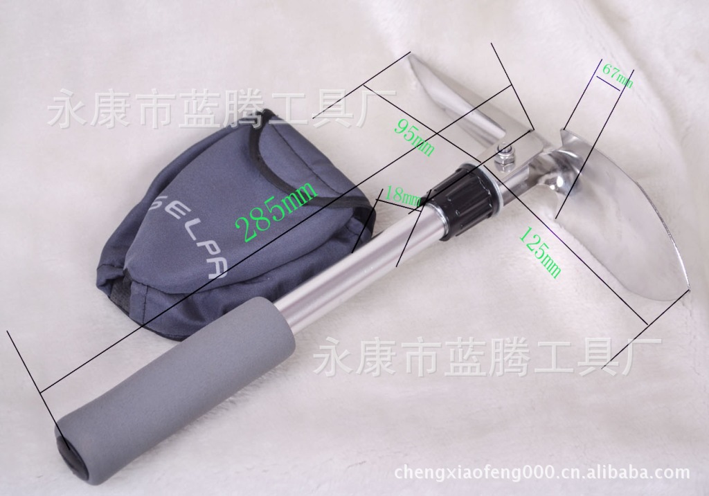 LT1017型折叠铲的最大特点就是手柄处有两个用TRP软性塑胶做成的护手套可以方便使用者作用力和更好的保护双手,顶部还有含油球型指南针。
