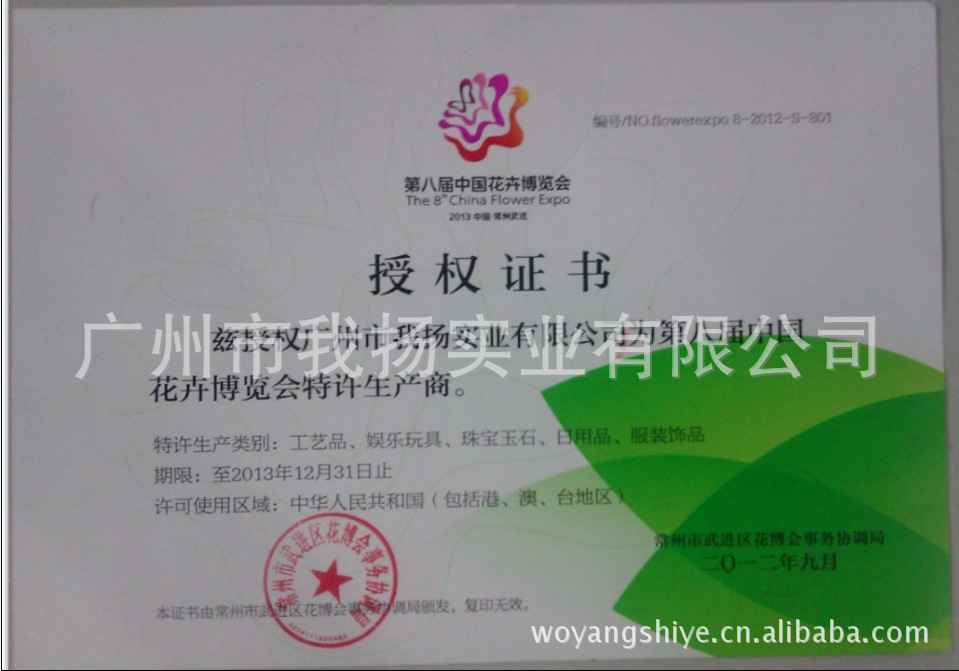 第八届中国花卉博览会授权证书: