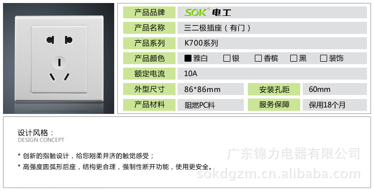 sok开关插座厂家价格 有门三二插公司专营SOK品牌K700系列SOK开关插座、sok开关插座厂家价格 有门三二插,开关插座面板,墙壁开关插座,开关插座底盒,防水开关插座,移动排插,工程开关插座,电工照明,节能灯电视等。sok开关插座厂家价格 有门三二插等产品率先通过ISO9001-2000国际质量管理体系认证、ISO14001国际环境管理体系认证、3C、欧洲CE等多项权威认证。sok开关插座厂家价格 有门三二插适用于各类楼道、走廊、卫生间、阳台、地下室车库等场所。