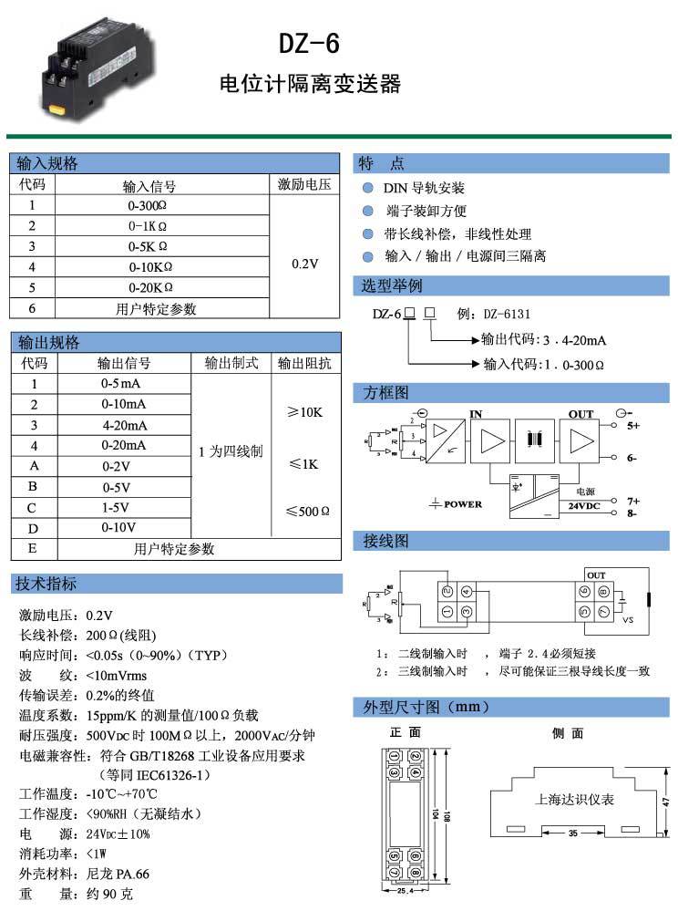 厂家直销电阻变送器/信号变送器/隔离变送器/电流变送器,电阻信号隔离变送器/DZ-6331A滑线电阻变送器(220V),电位计全隔离位移信号调理器内含传感器激励源;输入、输出、电源三端口隔离;DIN T型导轨卡装方式。如对产品有不详及其它技术需求,与我联系!