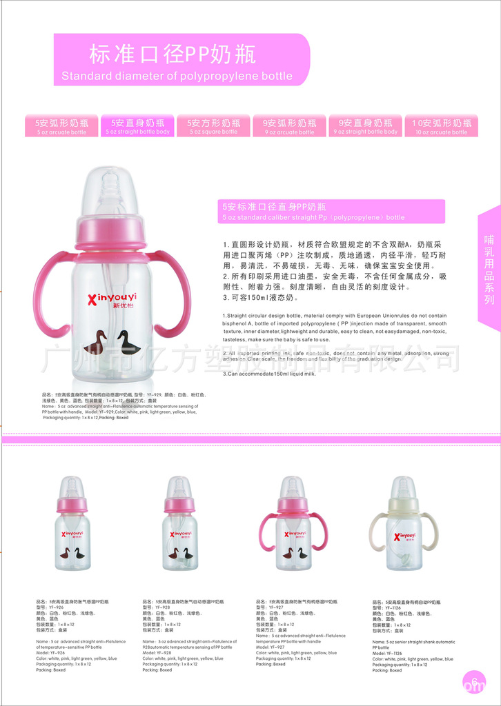 广州亿方塑胶制品有限公司是家集婴儿用品专业设计、开发、生产、销售、贸易为一体的最新科研技术、知识密集型企业,公司主要生产高级婴儿用品、奶瓶、奶嘴、PP奶瓶、硅胶奶瓶、玻璃奶瓶、塑料奶瓶、防胀气奶瓶、自动流量奶瓶、保温奶瓶、智教奶瓶、安抚奶嘴、学饮杯、料理匙、牙胶、哺喂碗、口腔机能训练器、训练牙刷、玩具、婴儿服饰、婴儿用湿纸巾、纸尿裤、婴儿用护肤品等婴儿日用品系列产品。本公司投资规模宏大,资产实力雄厚,公司采用香港、日本、德国最先进科研技术设备精制而成,技术力量雄厚,采用高科研技术生产经营模式,具有较强设计操作能力和管理能力,严格执行操作规程,加强生产管理确保产品质量。 公司婴幼儿产品主销欧美等世界各地,并有欧州几个知名品牌和国内十多个知名品牌授权以OEM形式加工制造。产品主要以超前思想理念,综合世界各品牌的特点,研发出更适用更安全的婴幼儿产品,公司产品原材料采用高级进口食品级PP、硅胶原材料,印刷油墨均采用日本进口环保型油墨,不含铅、铬,产品符合欧洲CE标准和美国FDA标准并且通过国家QS认证,产品质量、功能、价格具有绝对竞争优势。 公司目标:我们一贯主张,无论时代如何变化,哺育下一代是一项伟大而崇高的事业,公司全体员工将继续努力,把公司发展成知名的跨国企业,从而更好的把爱心传播到世界各地而不懈奋斗! 公司以“质量可靠、客户至上”为宗旨,以“求新求变、永续经营、造福人类,立足中华,放眼世界”为经营理念,大力投资开发具有创新水平的婴幼儿用品系列产品。为延伸服务领域,公司积极开拓市场,并将以优质多元化的产品服务社会,使广大妈妈真切感受到:“新优怡”——宝宝的最爱!妈妈放心、公司因扩大市场诚各地朋友加盟:共创辉煌。