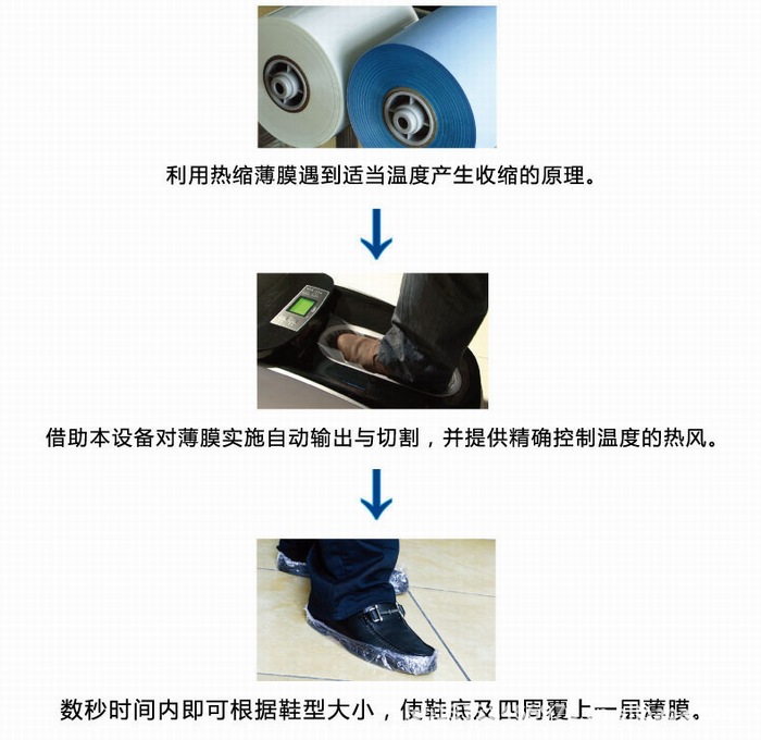 本司推荐产品为德国技术引进生产,最新型高科技全智能全自动化,不一同于传统型鞋套机,它是一种利用热缩原理实现鞋底覆膜/包膜(包底膜高1-1.5CM)隔绝鞋底灰尘的自动化专业设备。产品技术国际首创;产品通过国际权威的GS、CE等认证。因其兼具了容量大(一次换膜可使用1250人次)、寿命长(XT46A 80万次,XT46B 40万次,XT46C 20万次)、耗费省等特点,而被广泛应用于微电子车间、无尘厂房、机房室、微机房、食品加工厂、实验室、生物医药、精密仪器、光磁技术、生物工程、科研教学、海关检疫、航天航空高新技术产业、防疫中心等场所。
