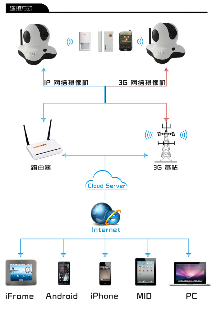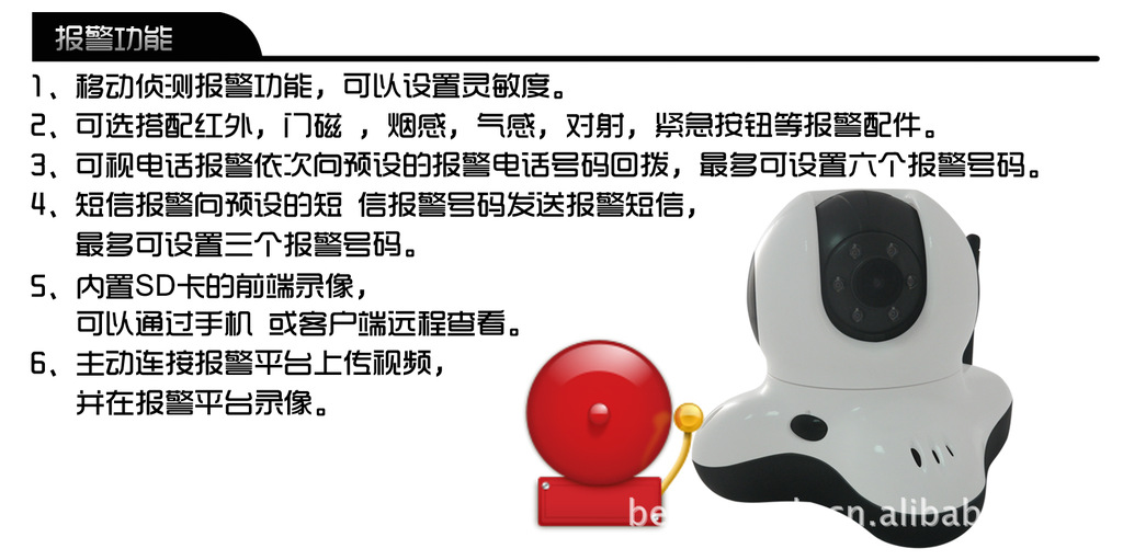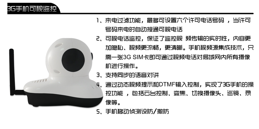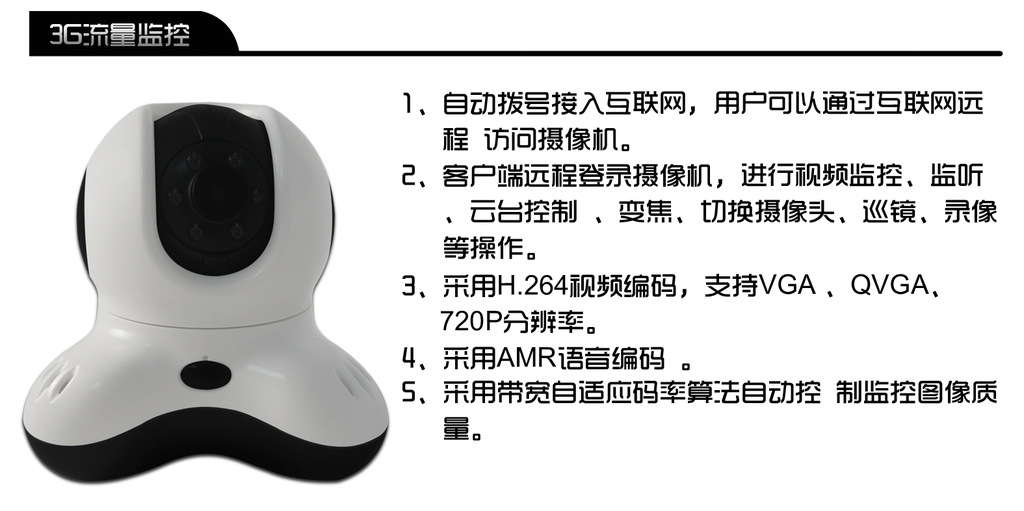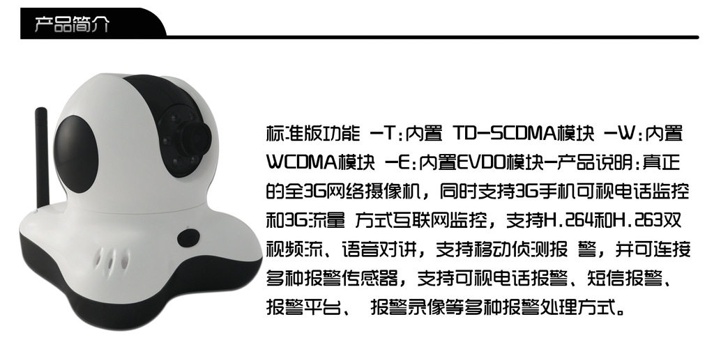 -Web配置管理功能:1、内置HTTP服务器,支持Web口令登录2、查看设备运行状态:系统信息(设备ID,厂商信息、序列号、版本、启动时间、运行时间)、3G网络信息(3G运营商信息、网络类型、注册状态、IMEI码、信号强度、SIM卡状态、拨号连接在线状态、IP地址、网关地址、DNS地址、流量统计)、报警设置状态(设防撤防状态、移动侦测设置状态、传感器连接状态、报警中心参数、可视电话报警状态、短信报警状态、报警录像参数)、以太网信息(MAC地址、地址类型、IP地址、子网掩码、网关地址、DNS地址、互联网连接状态)、视频源信息(镜头类型、码率、帧率、分辨率、OSD状态)、音频源信息(音频源类型(MIC/line-in)、音频采集状态、音频输出状态)等3、配置设备参数:以太网配置、3G网络配置、视频设置、音频设置、云台设置、移动侦测设置、报警设置、系统时间设置等4、管理功能:修改登录口令、恢复出厂默认配置、日志查询等5、视频窗口功能:查看实时视频、语音对讲、云台控制、报警提示-3G网络技术参数:-3G网络标准:TD-SCDMA/TD-HSDPAHSUPA/HSDPA/WCDMA/EDGE/GPRS/GSM-频率:GSM/GPRS/EDGE 900/1800MHzGSM/EDGE:900M/1800M/850M/1900MWCDMA:2100M/850M/1900M-传输速率:HSDPA速率:DL2.8Mbps/UL384Kbps,EDGE:236.8KbpsHSUPA 3GPP R6下行速率7.2Mbps上行速率5.76MbpsHSDPA 3GPP R6下行速率7.2Mbps上行速率384kbpsWCDMA 3GPP R5下行速率384kbps上行速率384kbpsEDGE EGPRS Class12下行速率237kbps上行速率118KbpsGPRS GPRS Class12下行速率85.6kbps上行速率42.8kbps-3G视频传输通道:可视电话通道(CS)和网络流量通道(PS)-短信:支持短信收发-信号强度检测:支持,低信号强度时蜂鸣提示-IMEI锁定:支持,与SIM卡绑定使用-视频技术参数:-图像传感器:1/3英寸Sony CCD CMOS传感器-视频制式:PAL/NTSC-像素数:PAL:500(H)×582(V) NTSC:510(H)×492 (V)-分辨率:Color 420TVL B/W 420TVL百万像素-日夜功能:有-自动光圈:支持-镜头特性:定焦镜头:8mm/F1.6可视角度:42度-照度:Color 0.5Lux/F1.2 B/W 0.05Lux/F1.2-信噪比:大于50dB-伽马校正:0.45-增益控制:自动-白平衡:自动-视频压缩标准:H.264+H.263-视频压缩分辨率:VGA/QVGA/CIF/QCIF/720P-视频帧率:PAL:25帧/秒,NTSC:25帧/秒,帧率可调-视频码率:32K~2Mbps码率可调,可设置等级或自适应调整-码流类型:视频流、音视频复合流-双码流:支持,H.264和H.263双视频流同时支持IP监控和可视电话监控-音频技术参数:-音频压缩标准:AMR-音频码率:12.2Kbps-音频输入:1路,RCA接口-音频输出:1路,RCA接口-报警技术参数:-移动侦测报警:支持,六级灵敏度-无线报警输入:红外、门磁、烟感、燃气、红外对射、玻璃破碎控测器、水感、紧急按钮、SOS医疗求救-有线报警输入:2路,信号量-报警输出:1路开关量-短信报警:支持-3G可视电话报警:支持-邮件报警:支持-报警录像:支持-其它技术参数:-镜头旋转角度:上下转动最大角度90度;水平转动最大角度270度.-有线网络:10BaseT/100BaseTX以太网,RJ45接口-无线网络:Wi-Fi 802.11g/n,无线网络连接支持WPS技术。