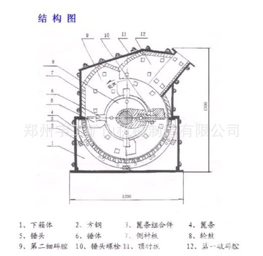 1、下箱体2、方钢3、篦条组合件4、篦条5、锤头6、锤体7、侧衬板8、轮鼓9、第二细碎腔10、锤头螺栓11、顶衬板12、第一破碎腔组成。