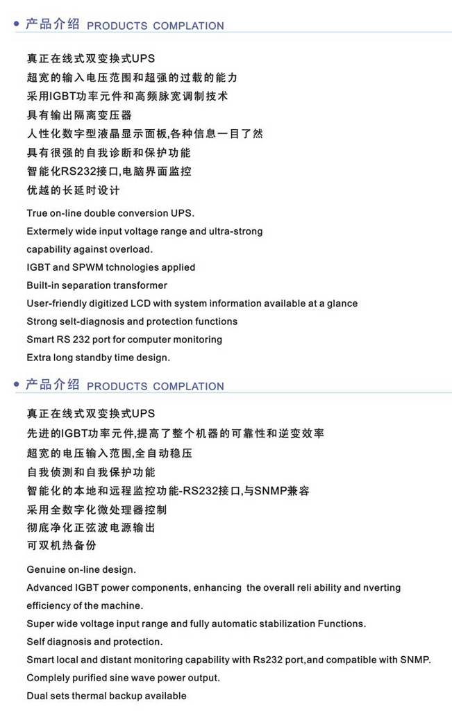 全系列不间断电源UPS(350VA-4800KVA)采用最先进DSP数码技术,提供最可靠的电源保护;完善的功能、齐全的系列配置,满足不同的需求.