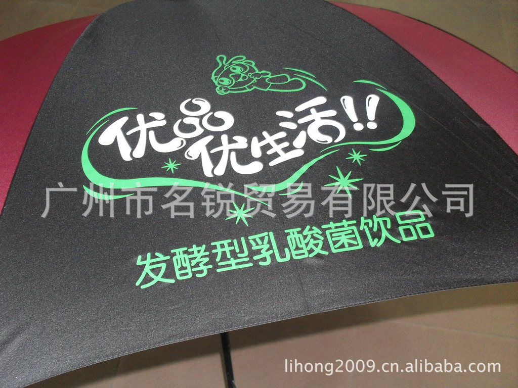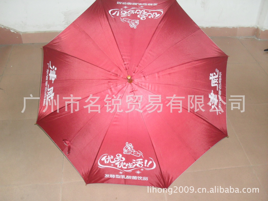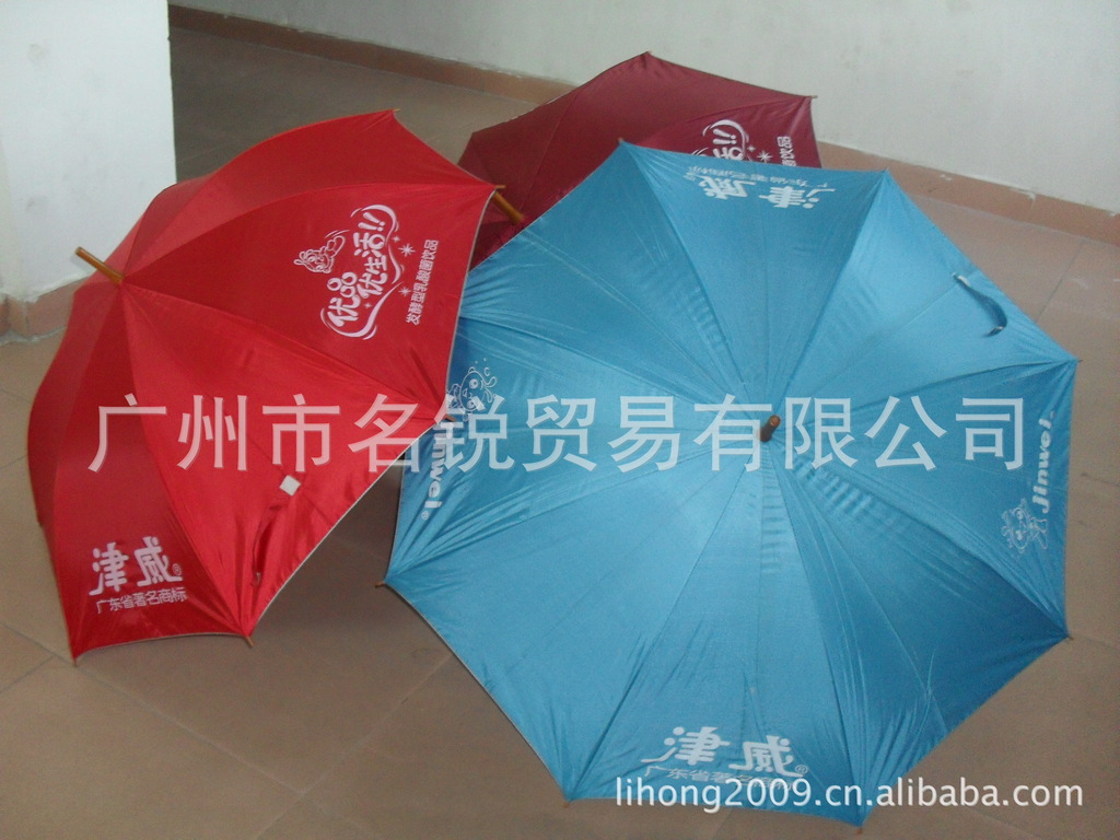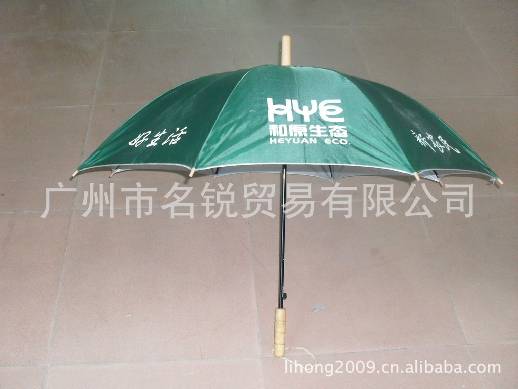 规格:30寸*8K高尔夫伞。 材料:玻璃纤维中棒、全纤维骨伞架。塑胶手柄。布料:190T尼龙布。印刷:两款单色。要根据选购者的年纪和性别来选购雨伞:厂家供应木中棒尼龙布热转印蓝天白云广告雨伞1、年轻姑娘可以选择色彩鲜艳的装潢精致的绸伞或尼龙伞;也可选便于在女式提包中收藏、携带方便的三节尼龙折叠伞。2、男青年要求轻便、灵活,可选素色尼龙面的二节或三节折叠伞;3、老年人行动迟缓,可选购55~65厘米不同规格的轻便尼龙面梅花骨长柄伞,晴天还可以伞代手杖助步。4、儿童活泼、好动,可选购伞顶部为球状塑料帽、伞骨尾端有塑料套头的儿童花布伞,以保障安全。雨伞质量鉴定法检查雨伞的质量,要注意下列几点:①伞面饱满,无脱线现象。②连续启用5~6次,撑肩不能脱落,撑键应坚实。③柄、梗、骨、面均应完整无损,电镀件应光滑。④面料防雨性能应强,尼龙伞面应吹气不透。⑤自动伞开启按钮应灵活;轻轻晃动,不致自行开启。雨伞防止伞面翻身法雨伞遇大风会被吹翻身,只要撑开伞,取一根细绳,一端系牢在一根伞骨尾端的鼻孔处,然后拉紧细绳依次绕到每根伞骨尾端拉紧并系牢,最后回到第一根伞骨处打结。经几次试验成功后,将细绳缝在伞边上即可。雨伞保养法①雨伞用过后,应即放在通风、干燥处撑开晾干,并在伞骨、伞柄处涂上少量润滑油,以防止生锈、发霉。②撑开雨伞前,应抖松伞面,理直伞骨,然后缓慢地撑开,可防止断裂。③不把伞挂在含有碱性的石灰墙壁上,可防止伞面发脆。④不用伞挑东西,不用伞当手杖,不让伞接近高温,可防止伞变形。