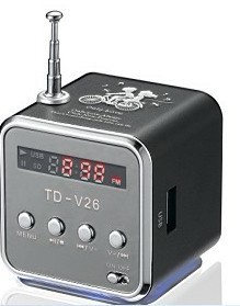 TD-V26以小巧见称尺寸只有50X50X50mm,重量轻。带屏显、FM收音等功能。铝合金外壳、铁质喇叭保护网让音箱抗摔耐用,4按键设计,直观简易,即用即会。
