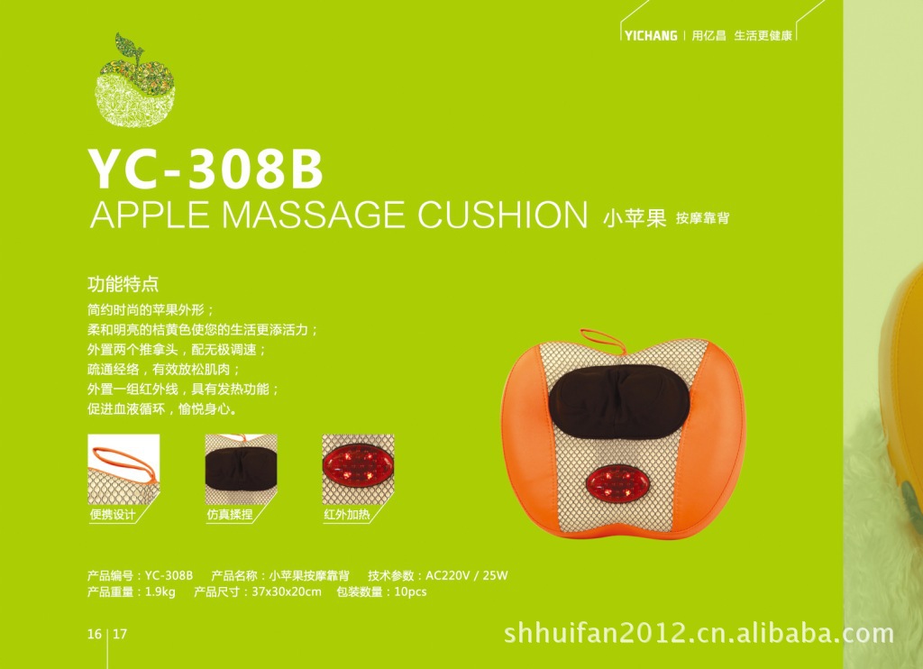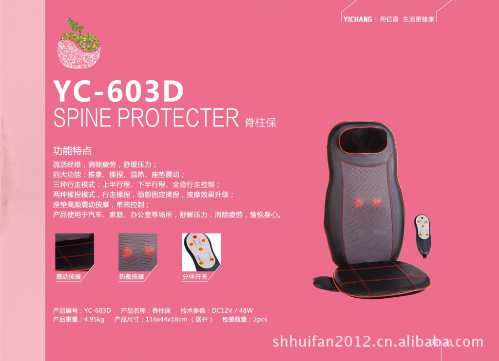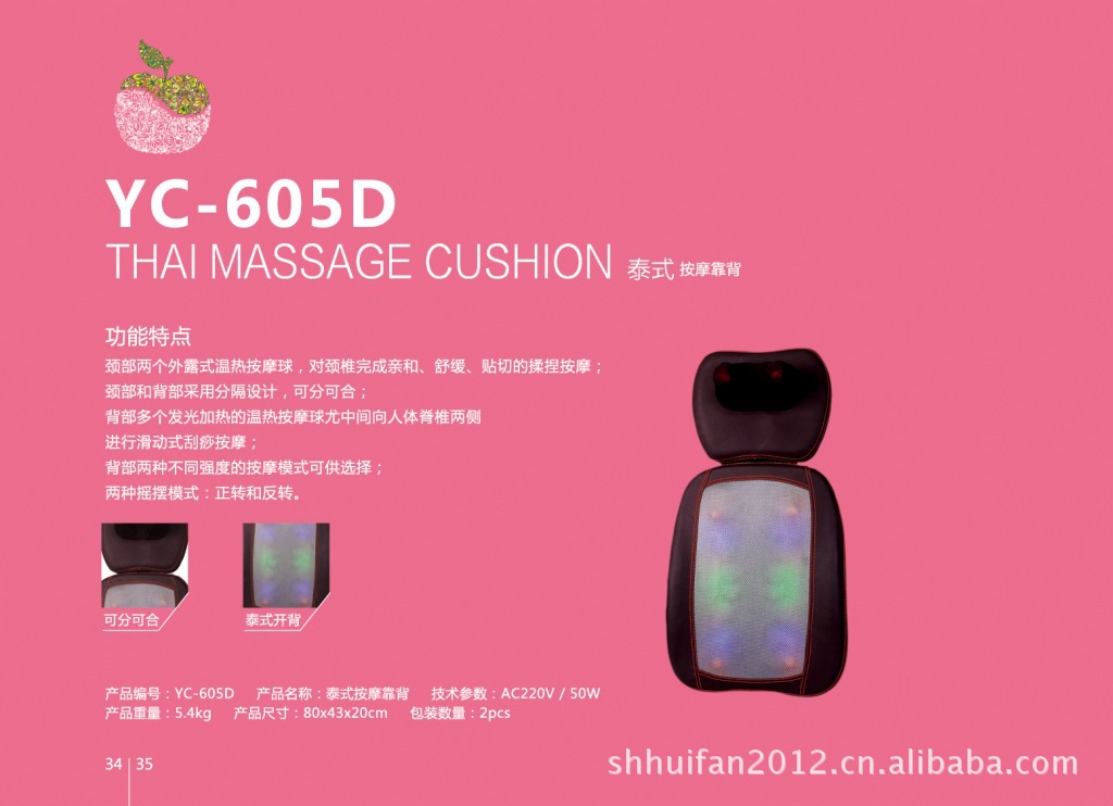 功能特点:经典、简洁的外观设计;颈部两个外露式温热大按摩球,仿真手感;背部四个温热按摩球,可对胸椎及两侧肌肉的推拿按摩;无极调速手控器(正反可调)腰部新设计六个温热按摩球,正传时可达到温热推拿效果,反转时可完成催击按摩手法。