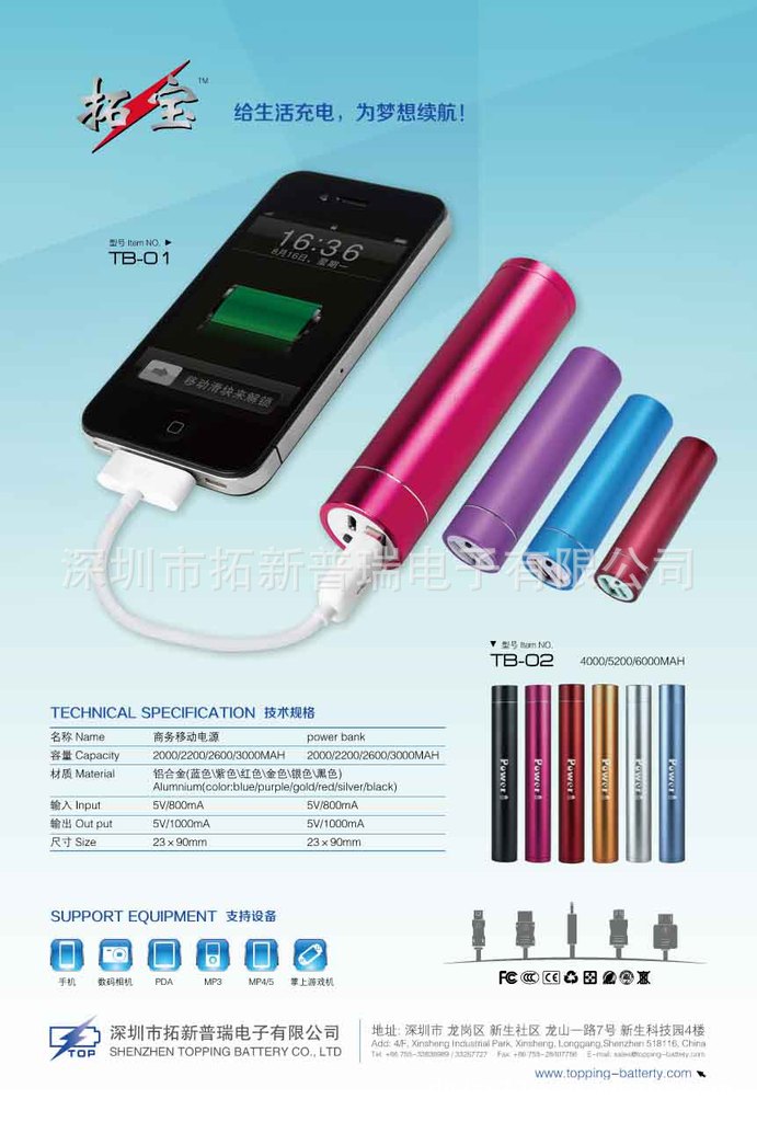 公司旗下的移动电源品牌拓宝TOPOWER,经过创新和不断更新,以其高品质、高性价比、时尚、新潮的形象深入人心,得到世界各地客人的赞誉和信赖,产品远销欧美、东南亚各国。