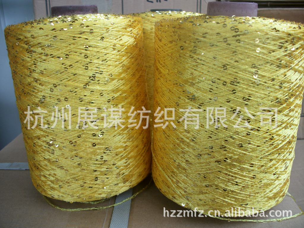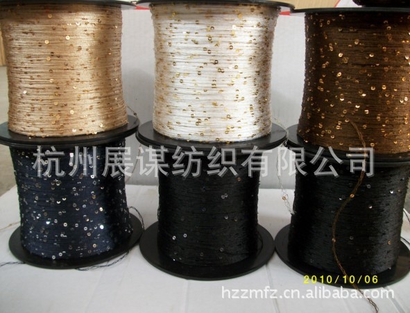 公司现有连线纱线机100余台,专业生产珠片纱,规格从108D-300D,亮片直径2MM-7MM都可以生产,线材料是环保型全涤纱线,亮片的材料:PVC环保材料.