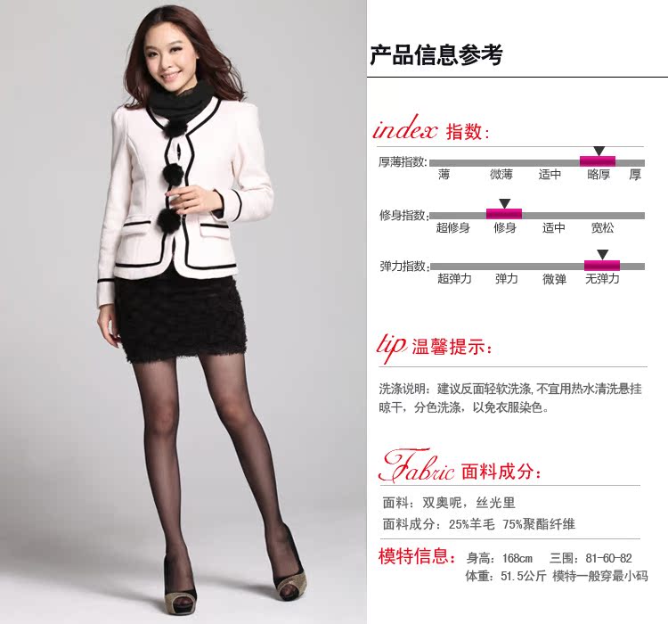 洗涤说明 | 手洗,悬挂晾干,分色洗涤,以免衣服染色;喷洒香水要注意远距离,以免留下黄斑。 |