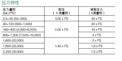 压力范围 从0-10到0-2200bar表压(250-30,000psi)