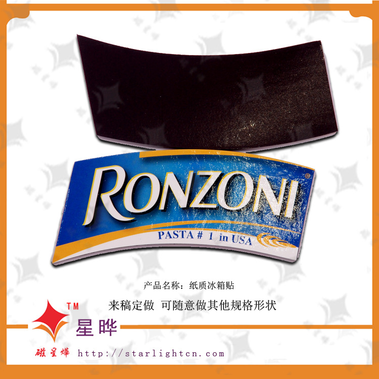 ①磁性冰箱贴:采用底面软胶磁铁、表面珠光纸、铜版纸、PVC彩色印刷过光胶或表面滴胶,背面贴橡胶磁制作而成