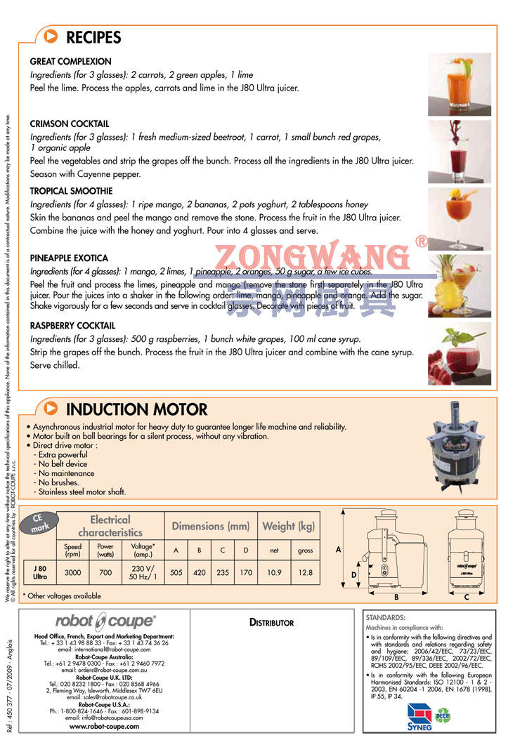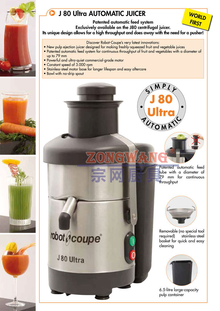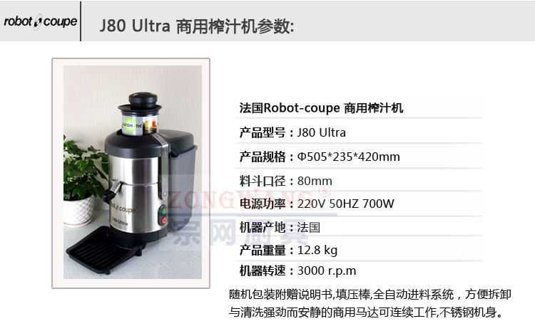 Robot coupe 罗伯特 J80 Ultra 进口商用大功率大口径蔬果榨汁机参数如下: