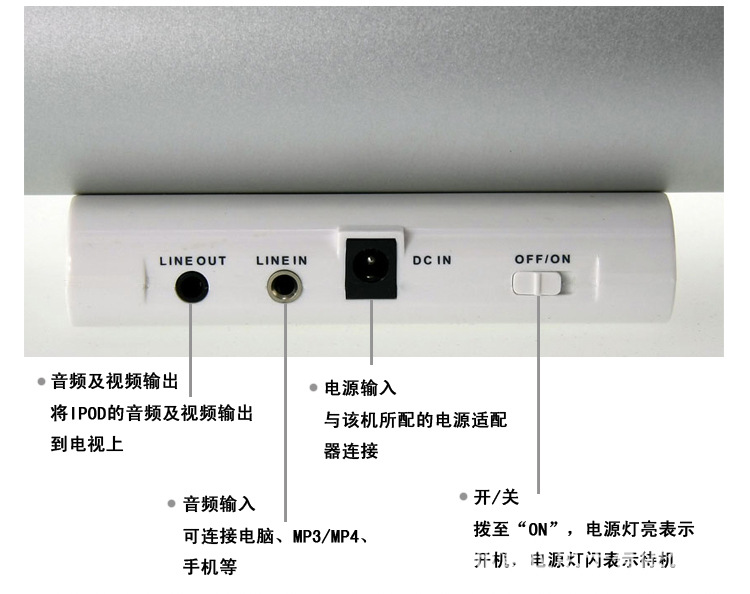 | 电源输入 | 12V/1500mA | LINE IN 接口 | 3.5mm立体声;ipod接口 |