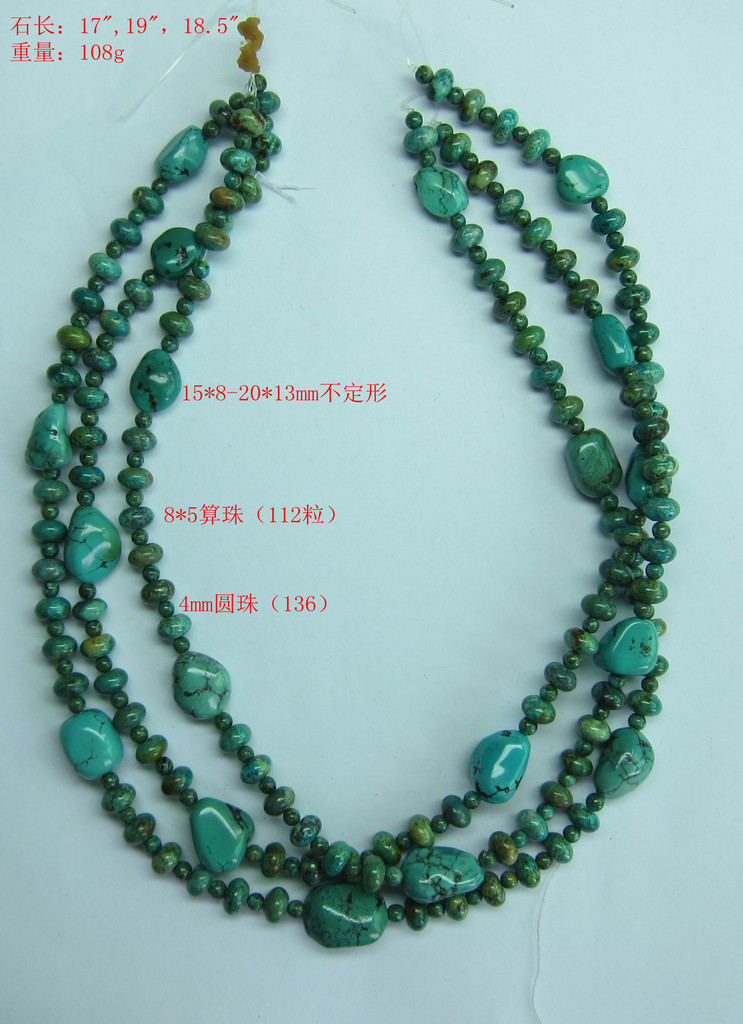 绿松石是四大名玉之一,特征-有从天蓝色到绿色的变化,取决于矿石内含铜何铁的含量比例。一般以微晶值得块状呈现,俱贝壳断口,通常为外包壳或为结核状。目前有实验室可制成人工松绿石,但同人工养晶一样,颜色十分均匀,与天然松绿石实有凹凸或其它内涵物颜色不同,很好辨认。由于往昔透过古丝路的起终点-土耳其运送至欧洲各国,因而得到土耳其石这个别名。