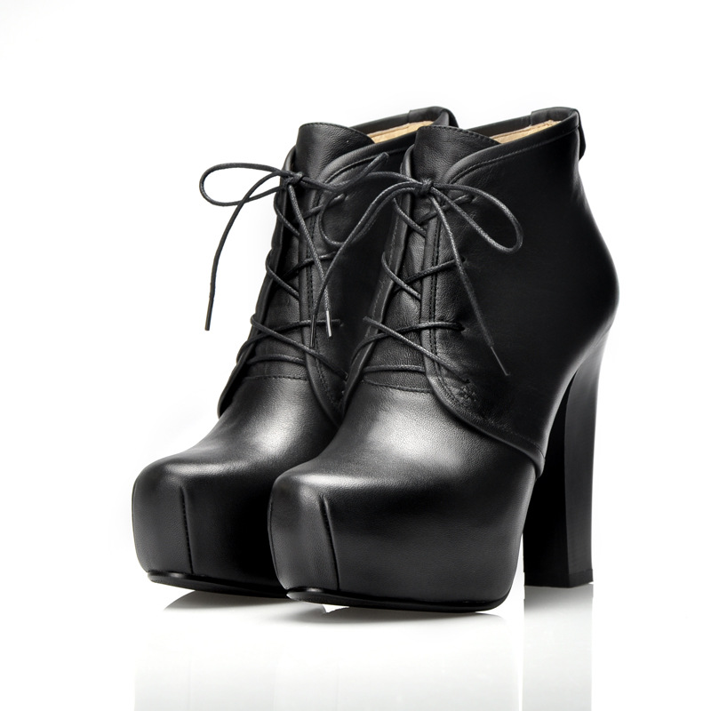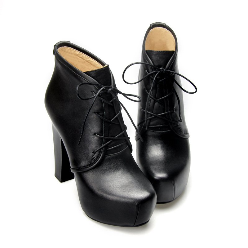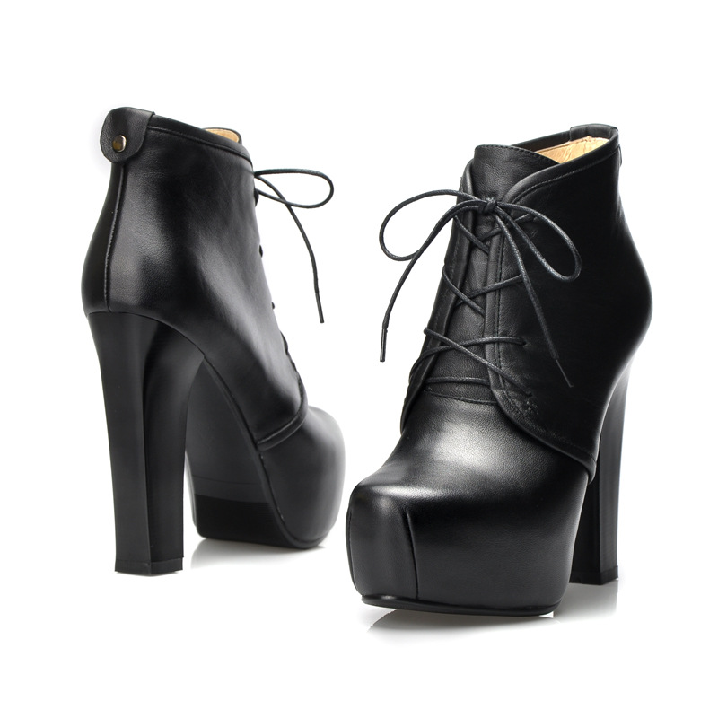 意大利进口头层小牛皮粗跟女靴短靴全真皮别致小方头系带女靴短靴