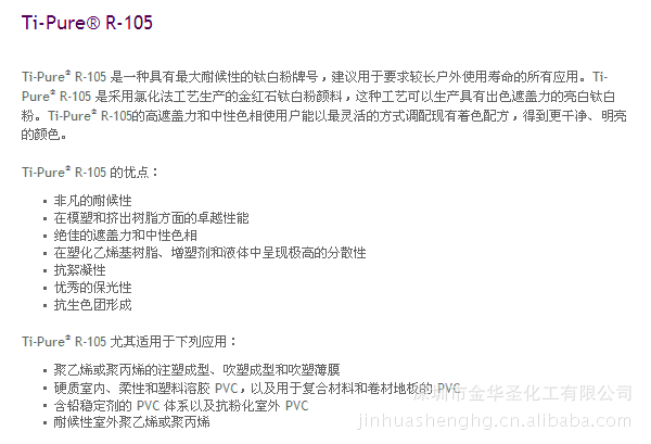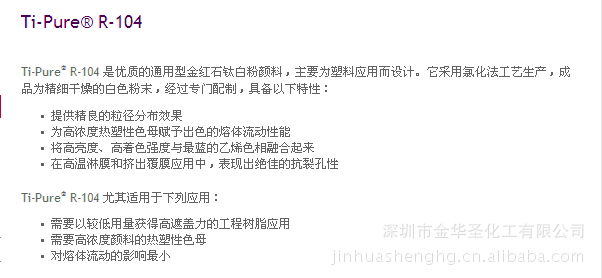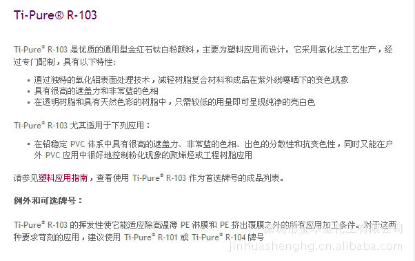 Ti-Pure®R-103 是优质的通用型金红石钛白粉颜料,主要为塑料应用而设计。它采用氯化法工艺生产,经过专门配制,具有以下特性: