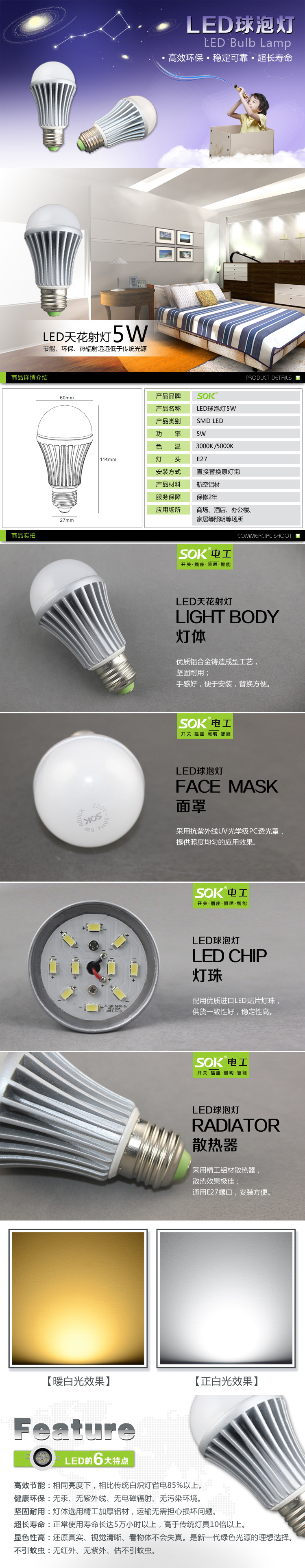 SOK厂家批发 球泡灯LED灯泡LED节能灯LED光源 E27螺口大功率5W