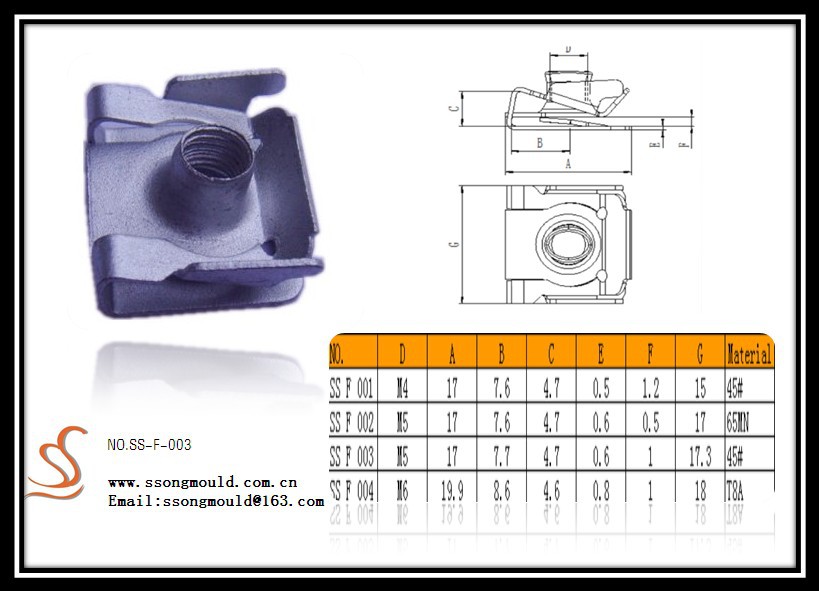 簧片螺母,又名插片螺母、夹片螺母,具有高强度的罗纹紧固作用,因其安装快速、便捷,被广泛应用于车辆部件的定位安装,有M4-M8系列,材料:弹簧钢,不锈钢,表面可做镀锌,发黑,达克罗处理。