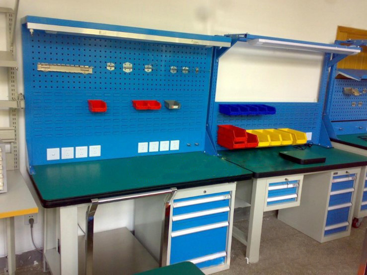 | 工作台桌面上可以增加不同的组件,如百页、方孔挂板,电源插座、照明灯具、吊具等。配合零件盒及各种不同的挂钩,工作台还可以存放各种常用的零件、工具等, |