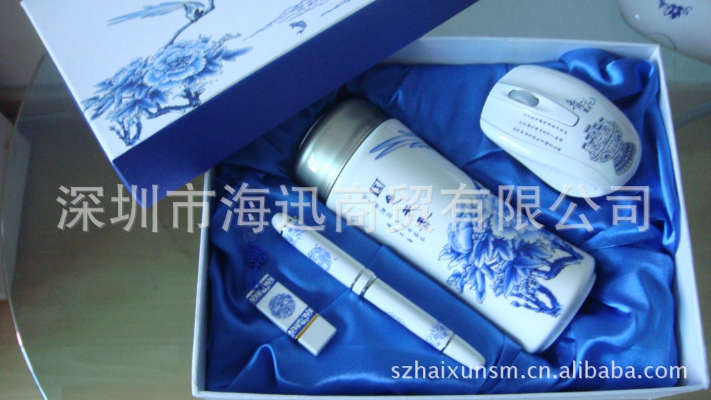 青花商务系列:青花瓷保温杯,青花瓷笔筒,青花办公杯,青花瓷笔、青花瓷钥匙扣、青花瓷书签、青花名片盒、青花丝绸笔记本、青花丝绸鼠标垫,青花纸镇、青花商务套装等;