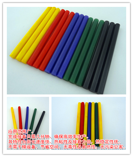 热熔胶棒常温下是一种百分之百的固体,加热后熔化,在常温下再凝固,完成接着只需几分钟,确保高效率生产。其特性为固化速度快,热粘性及接着力佳,热稳定性优。应用范围广。不需干燥设备,节省空间;无毒性及易燃性;无污染公害,长期储存,不会变质。