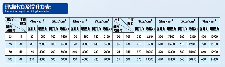 2、上表中的缸径及出力表表中的出力值系指工作气压为6kg/cm 时的出力吨位值。
