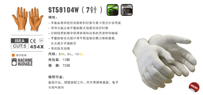 特性:由高性能防切割材料纤维与莱卡混合针织而成可单独使用或作为其他手套的保护衬垫它的轻质能够令使用者保持出色的灵活性和触感结合式设计将手部运动的阻力降到最低,有效缓解手部疲劳可机洗与消毒尺码:8/M 、9/L、10/XL内包装:12副外包装:72副推荐行业:食品行业、轻型装配工作、汽车零部件组装、电子与电气配件、******