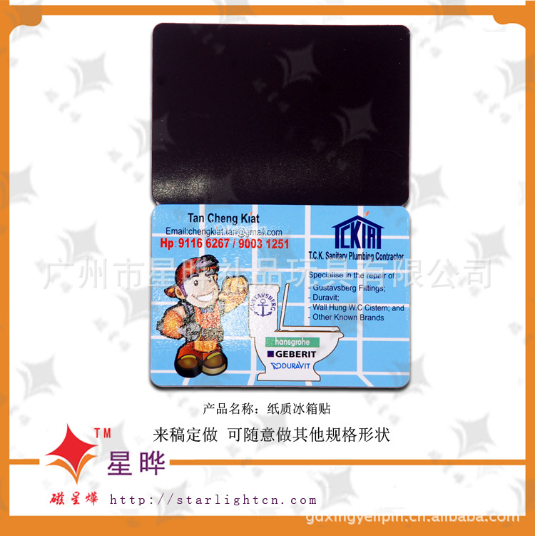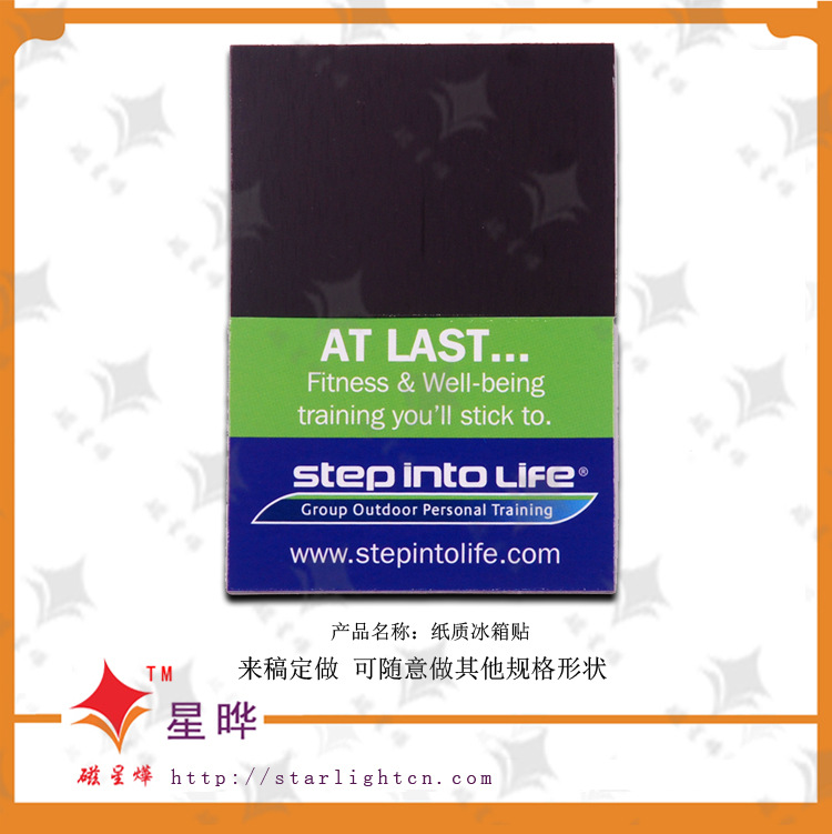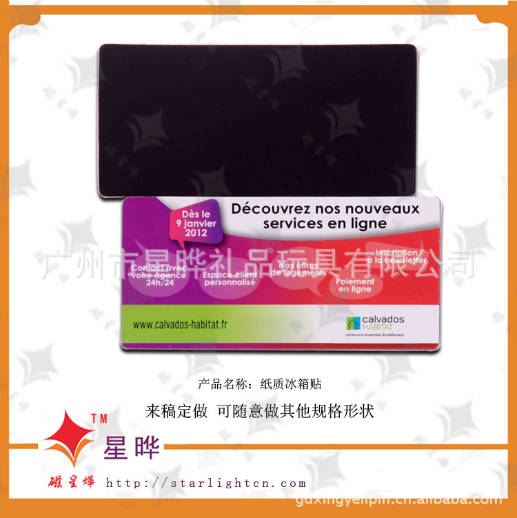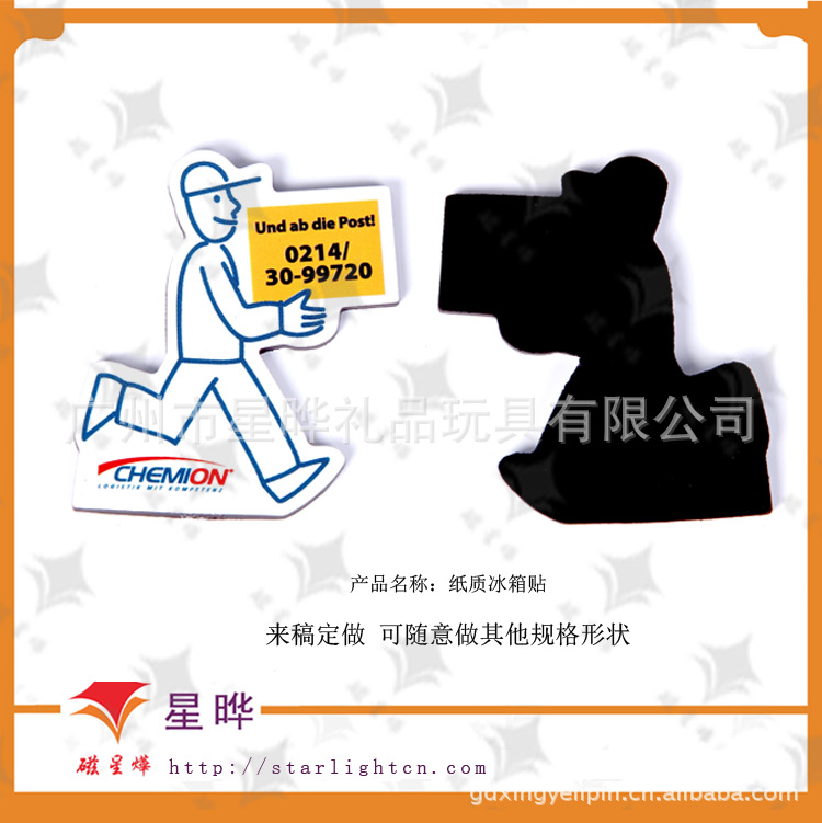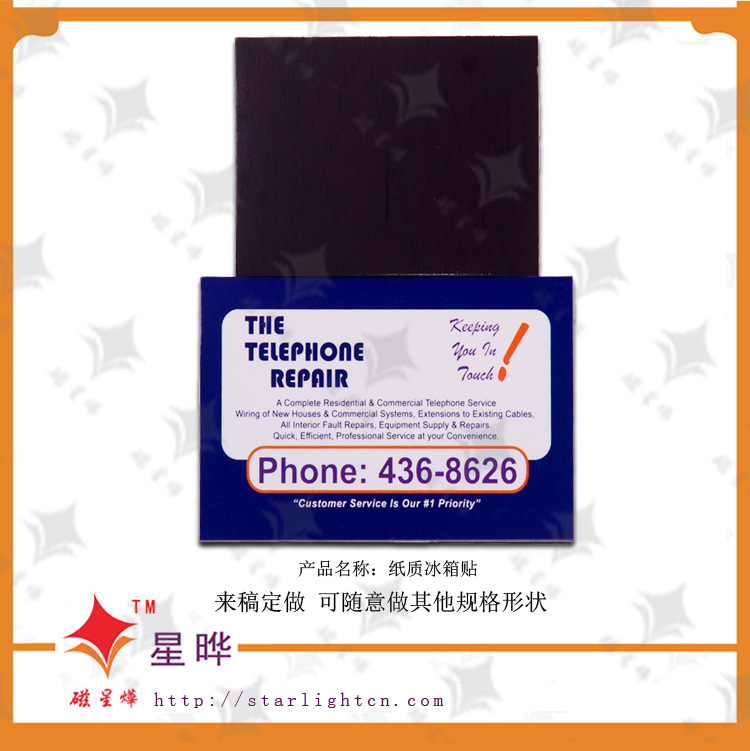 本产品采用磁性材料裱铜版纸彩色印刷腹膜制作而成,色彩丰富,使用寿命长,移动方便,自由组合,避免了粘贴胶质遗留痕迹的问题,可贴于冰箱贴等任何金属平面物体外表。使用范围广,是商务促销的最佳选择。