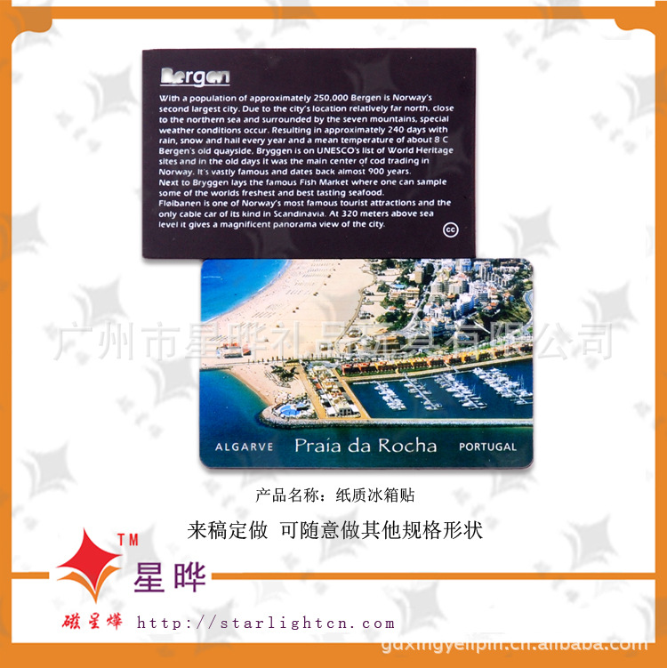 1)磁性冰箱贴:采用下面软胶磁铁+上面铜版纸彩色印刷腹膜制作而成。