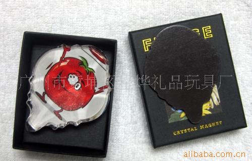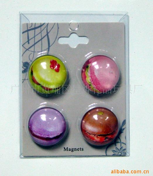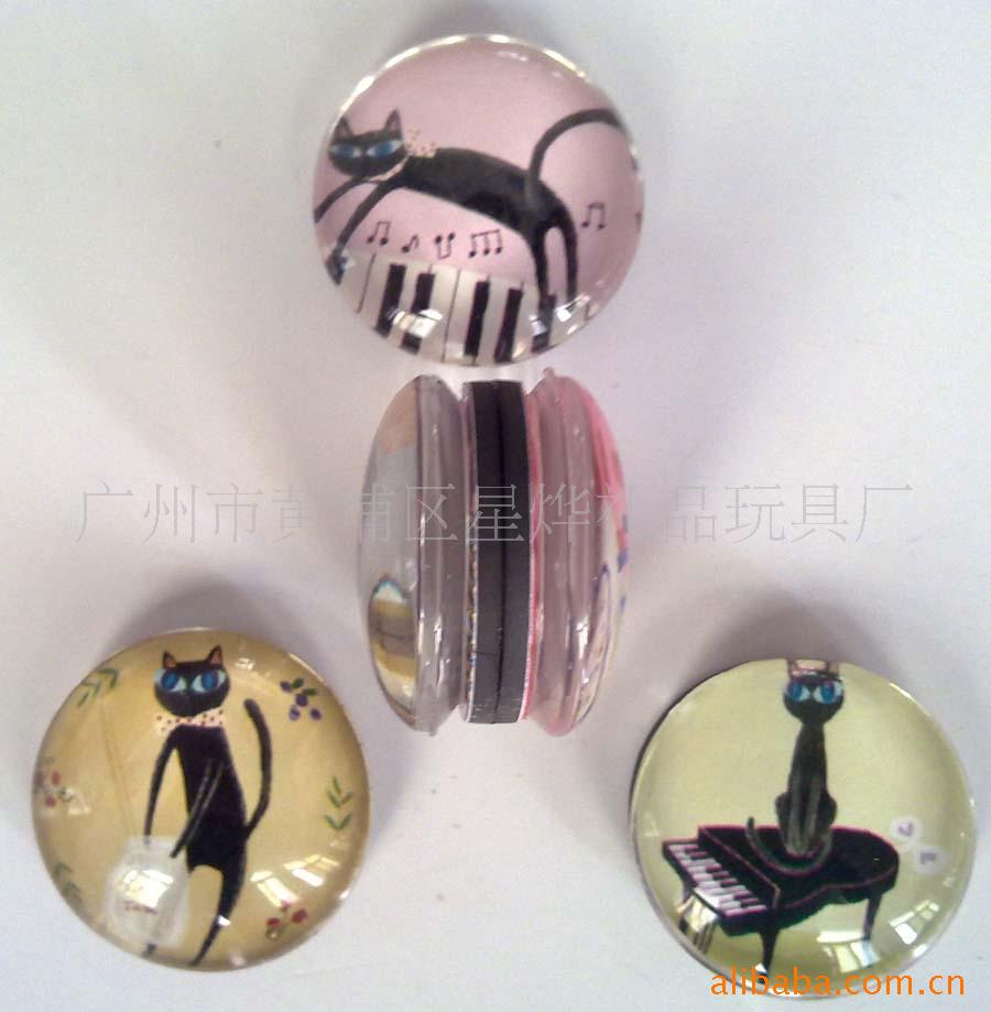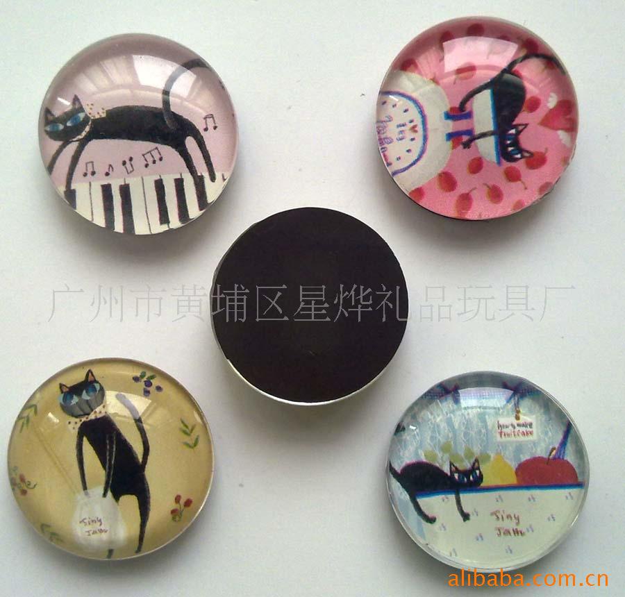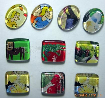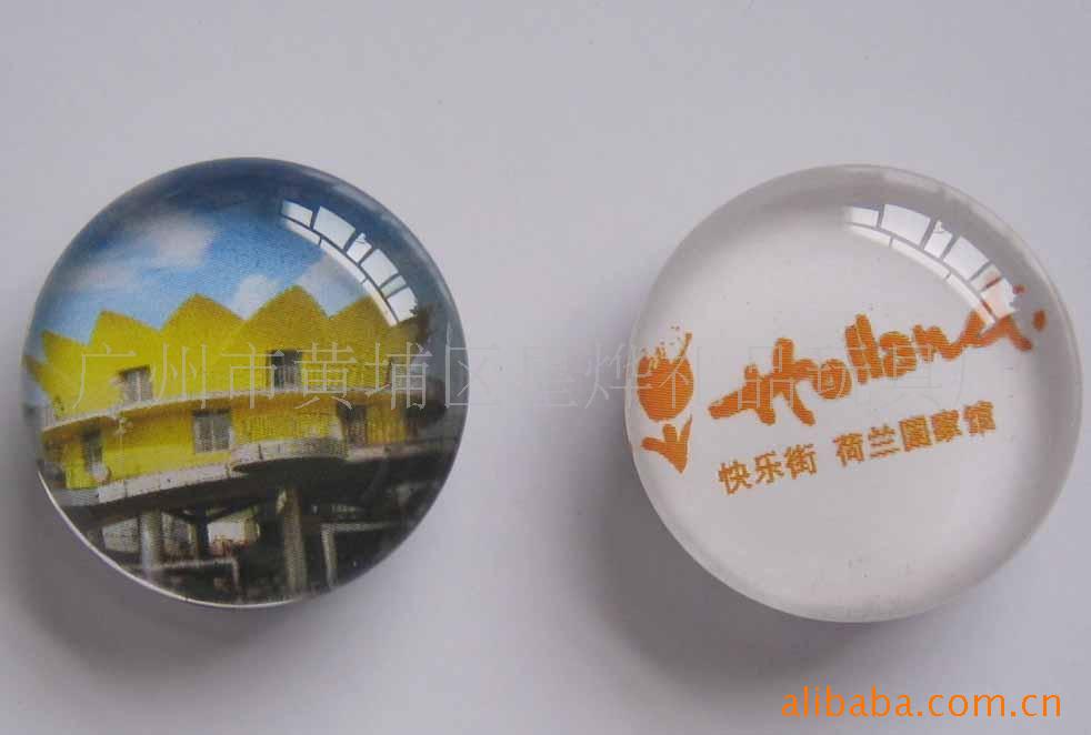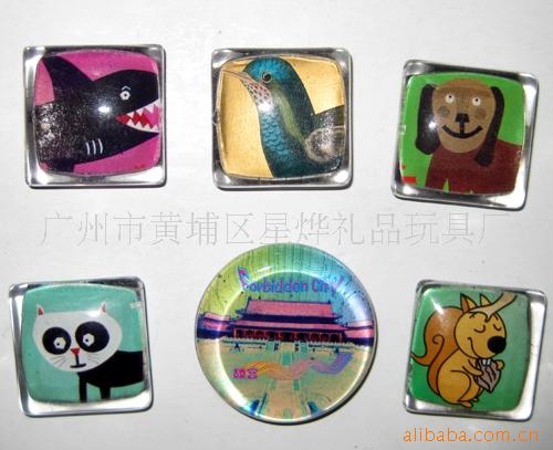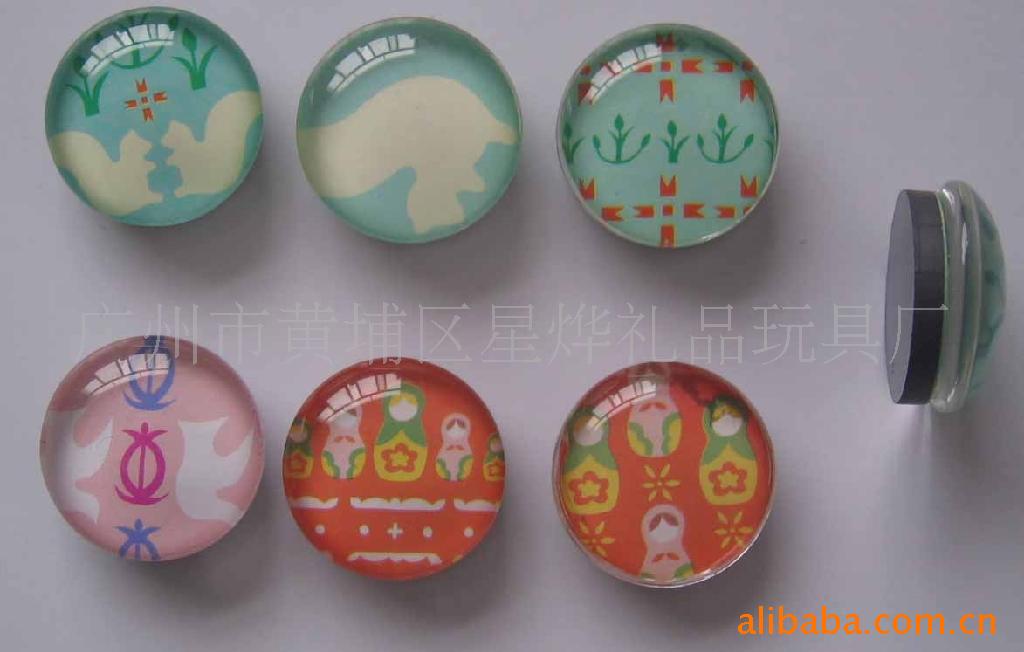 11)玻璃冰箱贴:采用下面软胶磁铁+上面铜版纸彩色印刷+半圆玻璃窗腹膜制作而成