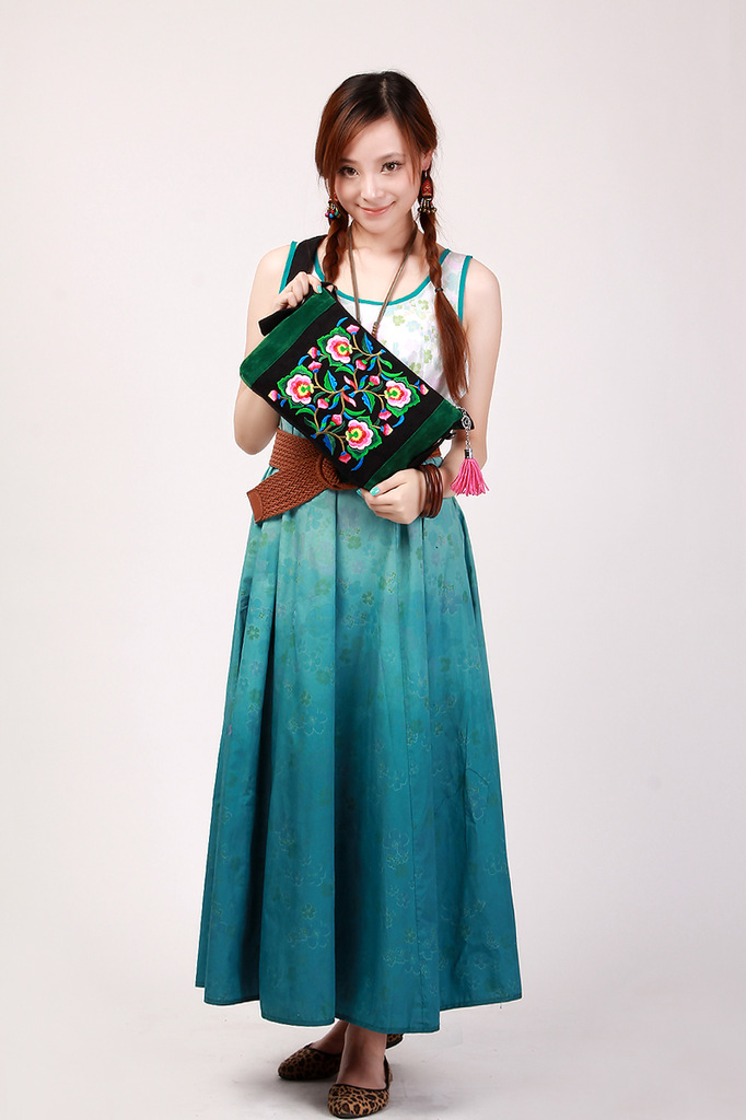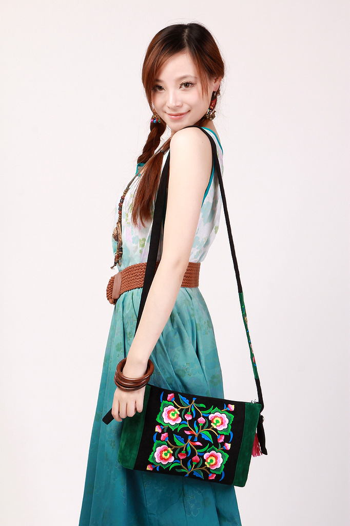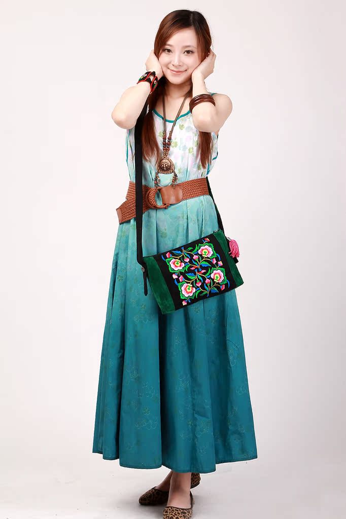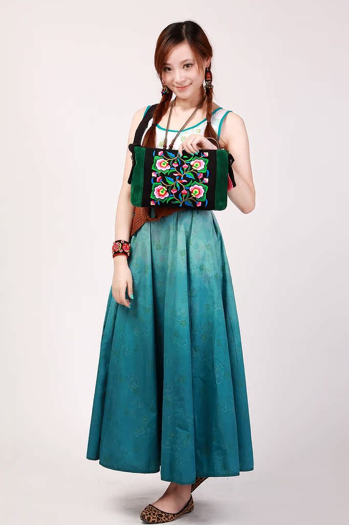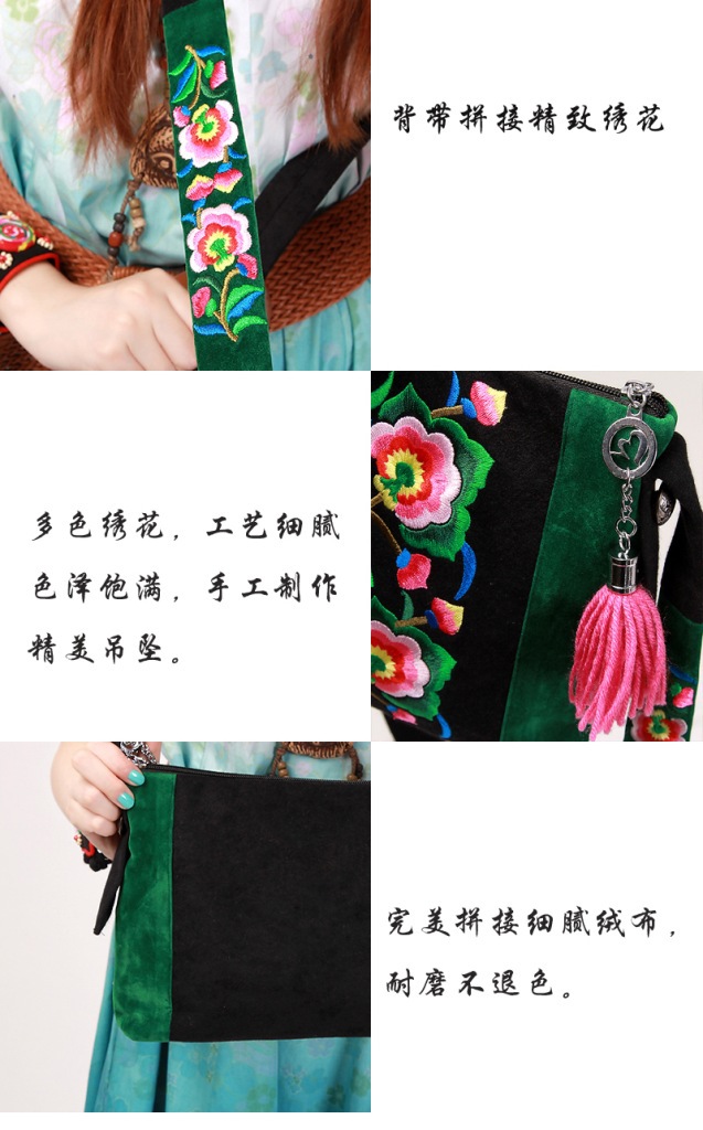 艺印轩 原创民族范小挎包 绿色刺绣包 绒布面料
