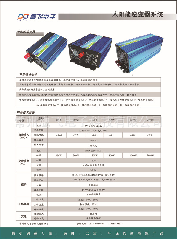 常州鹰飞电子科技有限公司是一家集控制器、逆变器、小型家用发电系统、便携式电源、LED灯、太阳能(风能)发电机、太阳能(风能)户外发电系统、太阳能配件、太阳能路灯、太阳能草坪灯、组件支架、光伏建筑一体化发电系统以及各种太阳能(风能)电站等太阳能应用产品于一身的高新技术企业,公司成立于2012年1月,注册资本50万,坐落在中国华东美丽的太湖湖畔江苏溧阳市。左邻历史文化名城南京,右濒国际大都市上海。距南京一小时、上海两小时的车程,交通便利。