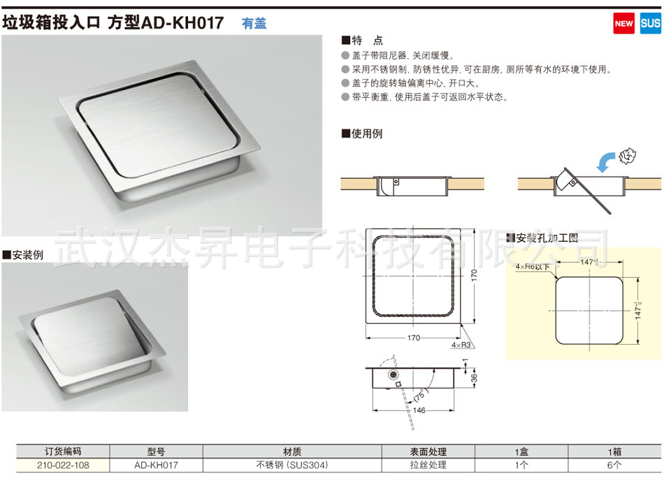 垃圾箱投入口 ■ 特 点 ● 盖子带阻尼器,关闭缓慢。 ● 采用不锈钢制,防锈性优异,可在厨房、厕所等有水的环境下使用。 ● 盖子的旋转轴偏离中心,开口大。 ● 带平衡重,使用后盖子可返回水平状态。