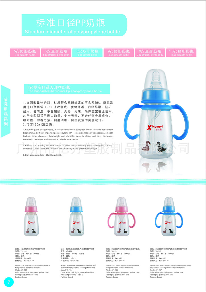 广州亿方塑胶制品有限公司是家集婴儿用品专业设计、开发、生产、销售、贸易为一体的最新科研技术、知识密集型企业,公司主要生产高级婴儿用品、奶瓶、奶嘴、PP奶瓶、硅胶奶瓶、玻璃奶瓶、塑料奶瓶、防胀气奶瓶、自动流量奶瓶、保温奶瓶、智教奶瓶、安抚奶嘴、学饮杯、料理匙、牙胶、哺喂碗、口腔机能训练器、训练牙刷、玩具、婴儿服饰、婴儿用湿纸巾、纸尿裤、婴儿用护肤品等婴儿日用品系列产品。本公司投资规模宏大,资产实力雄厚,公司采用香港、日本、德国最先进科研技术设备精制而成,技术力量雄厚,采用高科研技术生产经营模式,具有较强设计操作能力和管理能力,严格执行操作规程,加强生产管理确保产品质量。 公司婴幼儿产品主销欧美等世界各地,并有欧州几个知名品牌和国内十多个知名品牌授权以OEM形式加工制造。产品主要以超前思想理念,综合世界各品牌的特点,研发出更适用更安全的婴幼儿产品,公司产品原材料采用高级进口食品级PP、硅胶原材料,印刷油墨均采用日本进口环保型油墨,不含铅、铬,产品符合欧洲CE标准和美国FDA标准并且通过国家QS认证,产品质量、功能、价格具有绝对竞争优势。 公司目标:我们一贯主张,无论时代如何变化,哺育下一代是一项伟大而崇高的事业,公司全体员工将继续努力,把公司发展成知名的跨国企业,从而更好的把爱心传播到世界各地而不懈奋斗! 公司以“质量可靠、客户至上”为宗旨,以“求新求变、永续经营、造福人类,立足中华,放眼世界”为经营理念,大力投资开发具有创新水平的婴幼儿用品系列产品。为延伸服务领域,公司积极开拓市场,并将以优质多元化的产品服务社会,使广大妈妈真切感受到:“新优怡”——宝宝的最爱!妈妈放心、公司因扩大市场诚各地朋友加盟:共创辉煌。