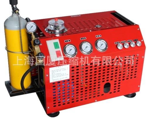 三级或者四级压缩、风冷、活塞式空气压缩机,配有高强度尼龙冷却风扇,高压安全阀压力自由调控,保障使用绝对安全,高新技术处理的耐磨的CMC合金气缸、活塞、曲轴等部件保证长时间负荷的要求,装配自动排污收集器和自动停机装置(也有手动型号),驱动方式有380V/220V电机(防爆电机)、柴油机、汽油机供用户自由选择,设计有一套或者两套充气阀、连接件和充气管(一套充瓶可以同时充一个气瓶;两套可以充两个气瓶),有时间允许记录系统,充气时间自由掌握,设有防震的压力表,净化系统为活性炭、分子筛保证出气纯净优质和安全。