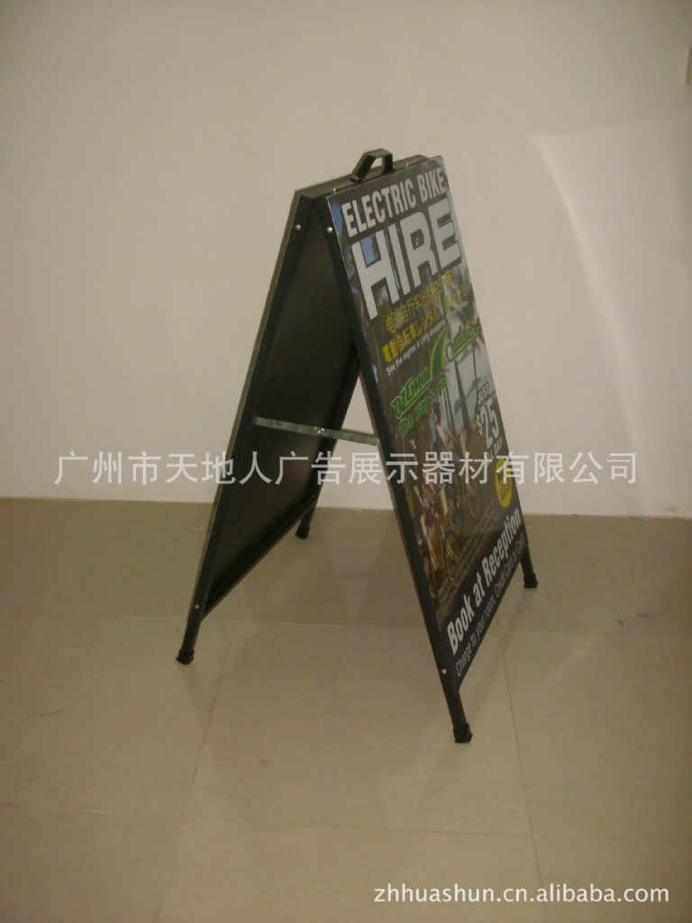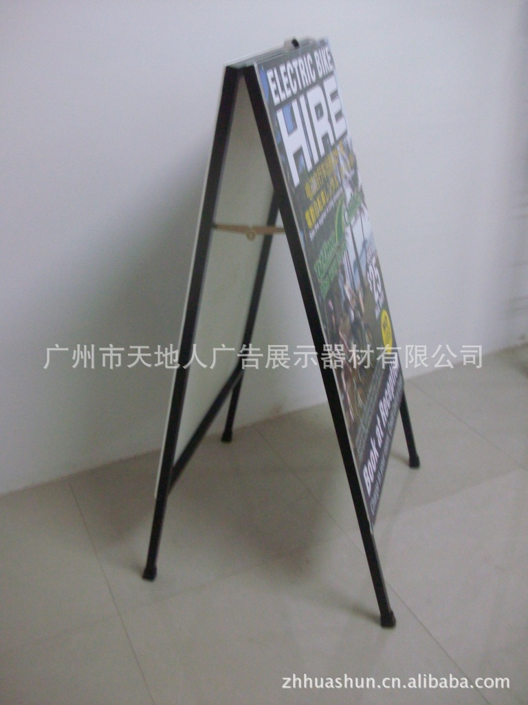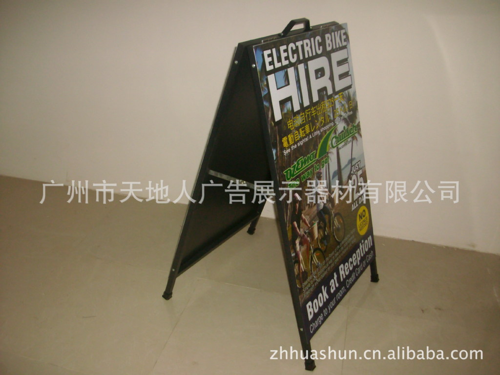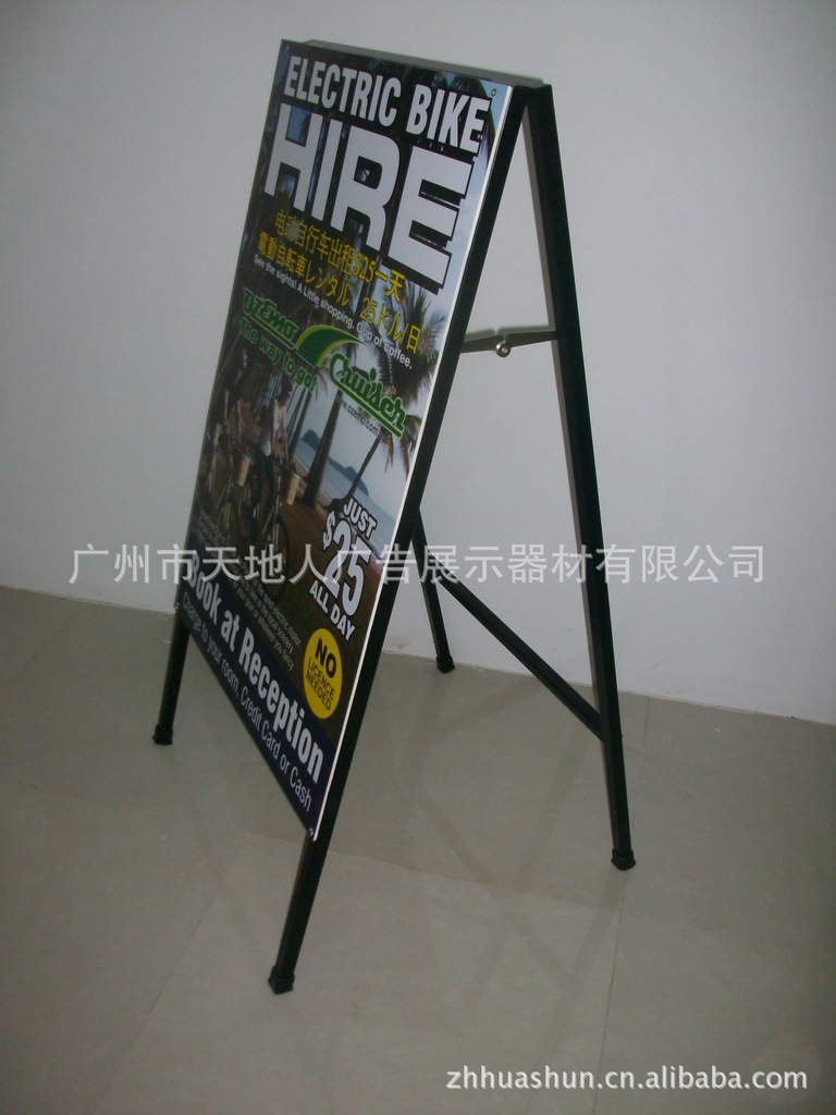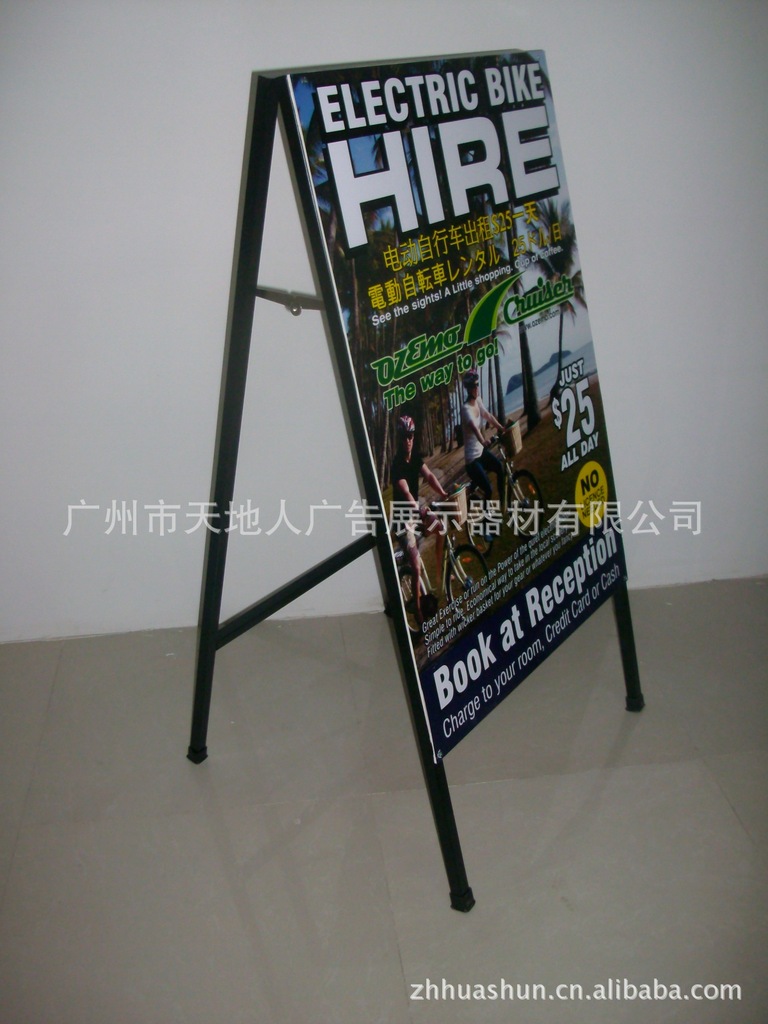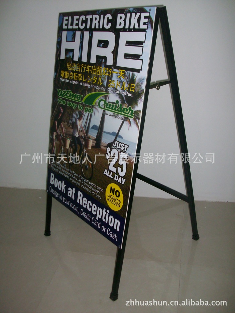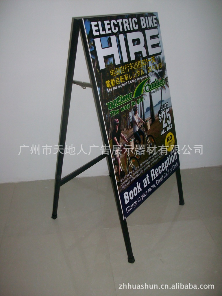 材质:20*20铁管喷涂黑色,高清喷绘户外防水背胶裱铁广告板,做工精致,焊接位平滑,携带方便,陈列稳定,配有防滑脚垫.