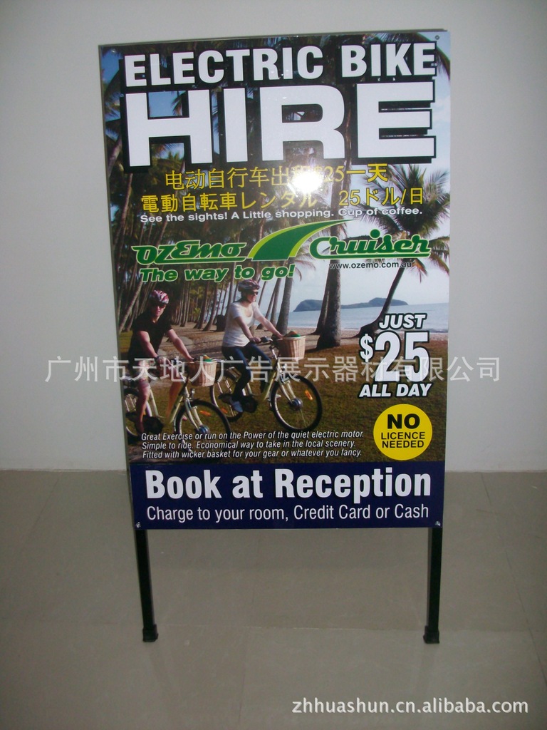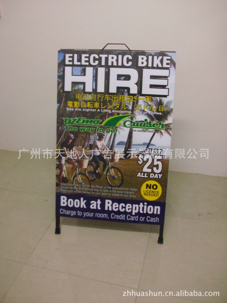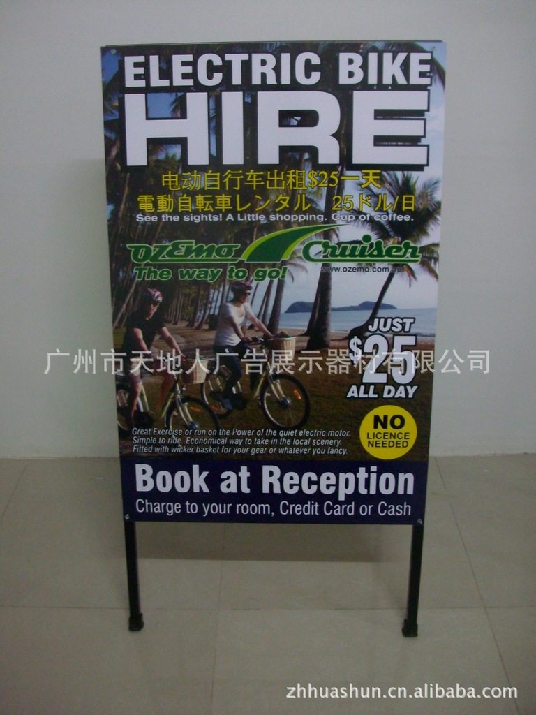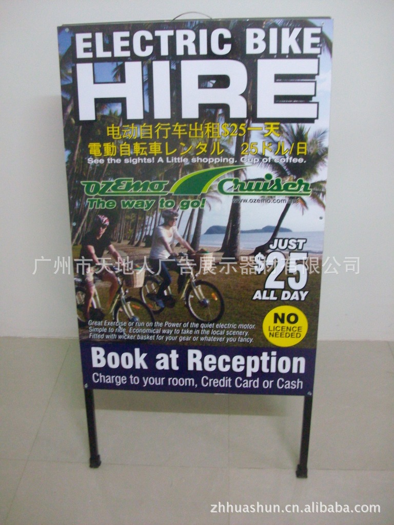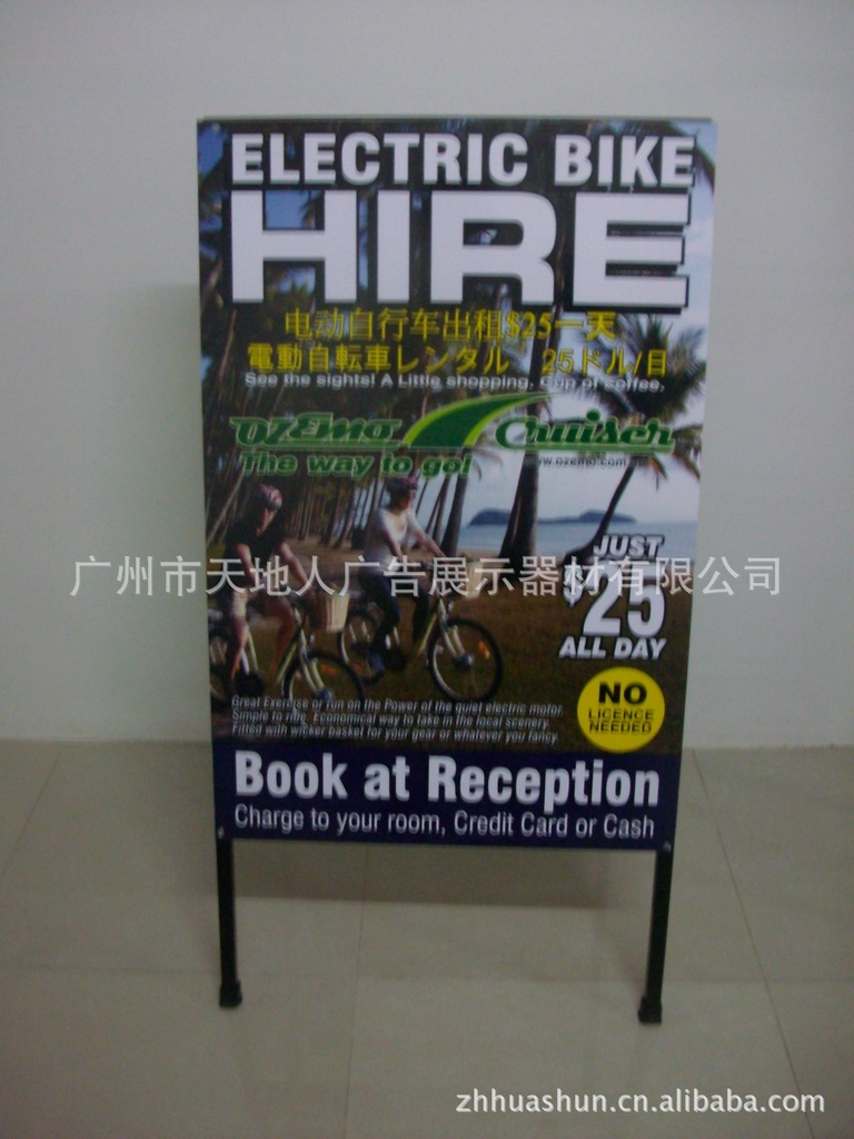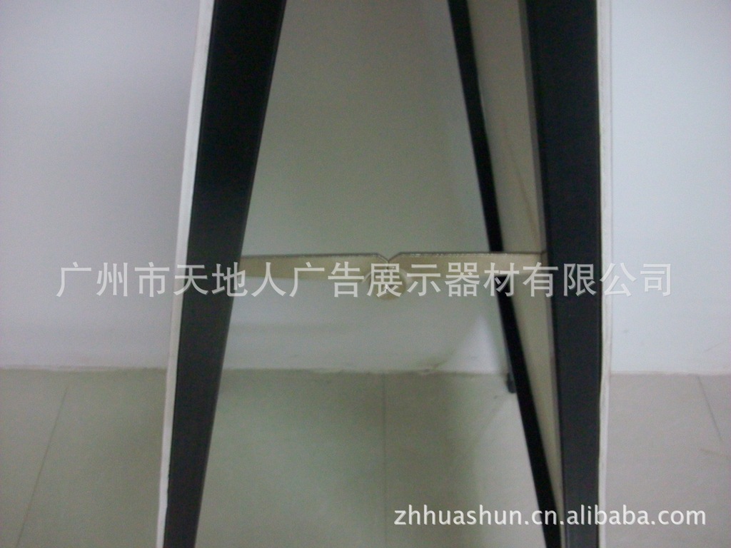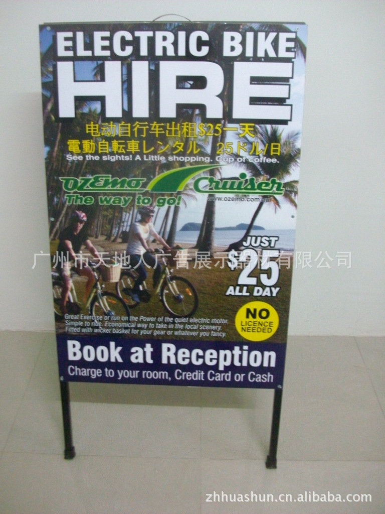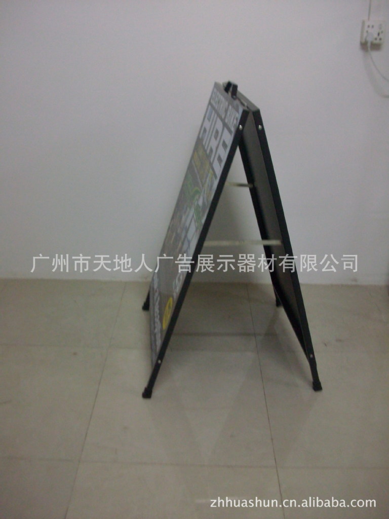 材质:20*20铁管喷涂黑色,高清喷绘户外防水背胶裱铁广告板,做工精致,焊接位平滑,携带方便,陈列稳定,配有防滑脚垫.