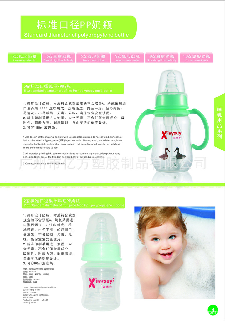 广州亿方塑胶制品有限公司是家集婴儿用品专业设计、开发、生产、销售、贸易为一体的最新科研技术、知识密集型企业,公司主要生产高级婴儿用品、奶瓶、奶嘴、PP奶瓶、硅胶奶瓶、玻璃奶瓶、塑料奶瓶、防胀气奶瓶、自动流量奶瓶、保温奶瓶、智教奶瓶、安抚奶嘴、学饮杯、料理匙、牙胶、哺喂碗、口腔机能训练器、训练牙刷、玩具、婴儿服饰、婴儿用湿纸巾、纸尿裤、婴儿用护肤品等婴儿日用品系列产品。本公司投资规模宏大,资产实力雄厚,公司采用香港、日本、德国最先进科研技术设备精制而成,技术力量雄厚,采用高科研技术生产经营模式,具有较强设计操作能力和管理能力,严格执行操作规程,加强生产管理确保产品质量。 公司婴幼儿产品主销欧美等世界各地,并有欧州几个知名品牌和国内十多个知名品牌授权以OEM形式加工制造。产品主要以超前思想理念,综合世界各品牌的特点,研发出更适用更安全的婴幼儿产品,公司产品原材料采用高级进口食品级PP、硅胶原材料,印刷油墨均采用日本进口环保型油墨,不含铅、铬,产品符合欧洲CE标准和美国FDA标准并且通过国家QS认证,产品质量、功能、价格具有绝对竞争优势。 公司目标:我们一贯主张,无论时代如何变化,哺育下一代是一项伟大而崇高的事业,公司全体员工将继续努力,把公司发展成知名的跨国企业,从而更好的把爱心传播到世界各地而不懈奋斗! 公司以“质量可靠、客户至上”为宗旨,以“求新求变、永续经营、造福人类,立足中华,放眼世界”为经营理念,大力投资开发具有创新水平的婴幼儿用品系列产品。为延伸服务领域,公司积极开拓市场,并将以优质多元化的产品服务社会,使广大妈妈真切感受到:“新优怡”——宝宝的最爱!妈妈放心、公司因扩大市场诚各地朋友加盟:共创辉煌。