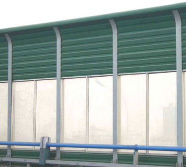 声屏障主要由钢结构立柱和吸隔声屏板两部分组成,立柱是声屏障的主要受力构件,它通过螺栓或焊接固定在道路防撞墙或轨道边的预埋钢板上;吸隔声板是主要的隔声吸声构件,它通过高强弹簧卡子将其固定在H型立柱槽内,形成声屏障。铁路声屏障,高度在1m一5m间,覆盖有效区域平均降噪达10~15dB(A)(125Hz~40000Hz,1/3倍频程),最高达20dB(A)。一般来讲,声屏障越高,或离声屏障越远,降噪效果就越好。
